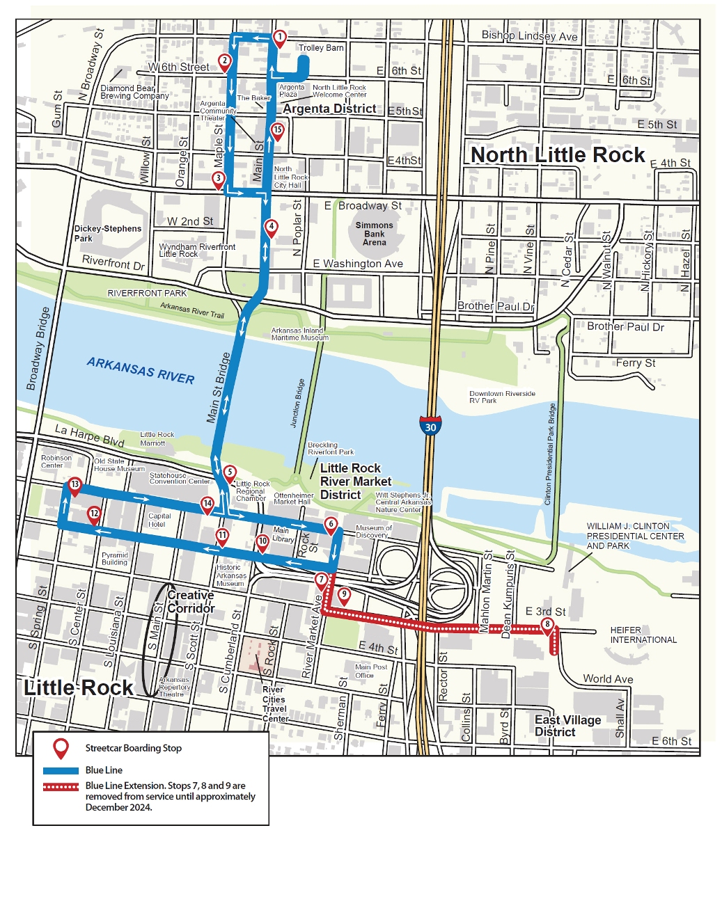 The Trolley is a convenient way to go across the Arkansas River between Little Rock and North Little Rock. Stops 3 and 4 are within a block or so of the Wyndham Riverfront Hotel.