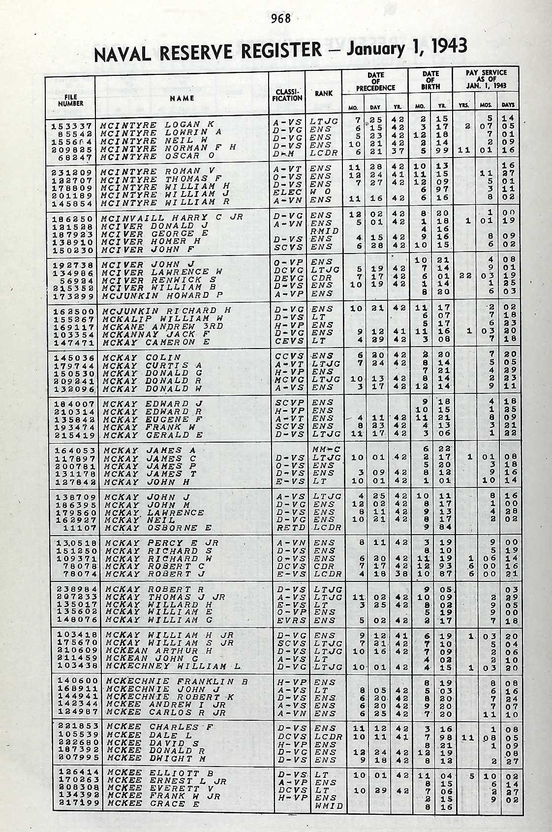 The first document is the Naval Reserve Register, January 1, 1943, and Lt (jg) William L McKechney's name is in the bottom section.