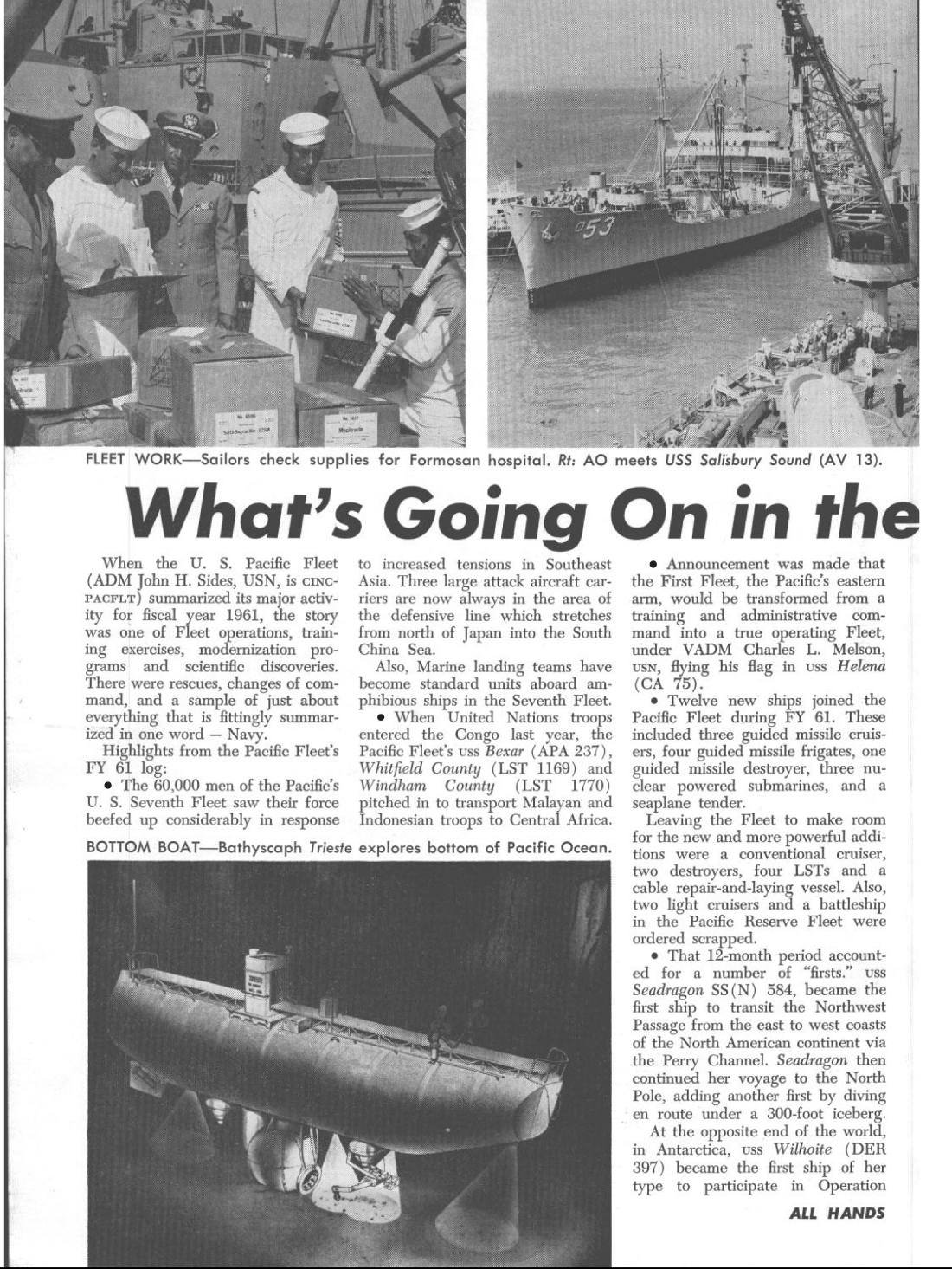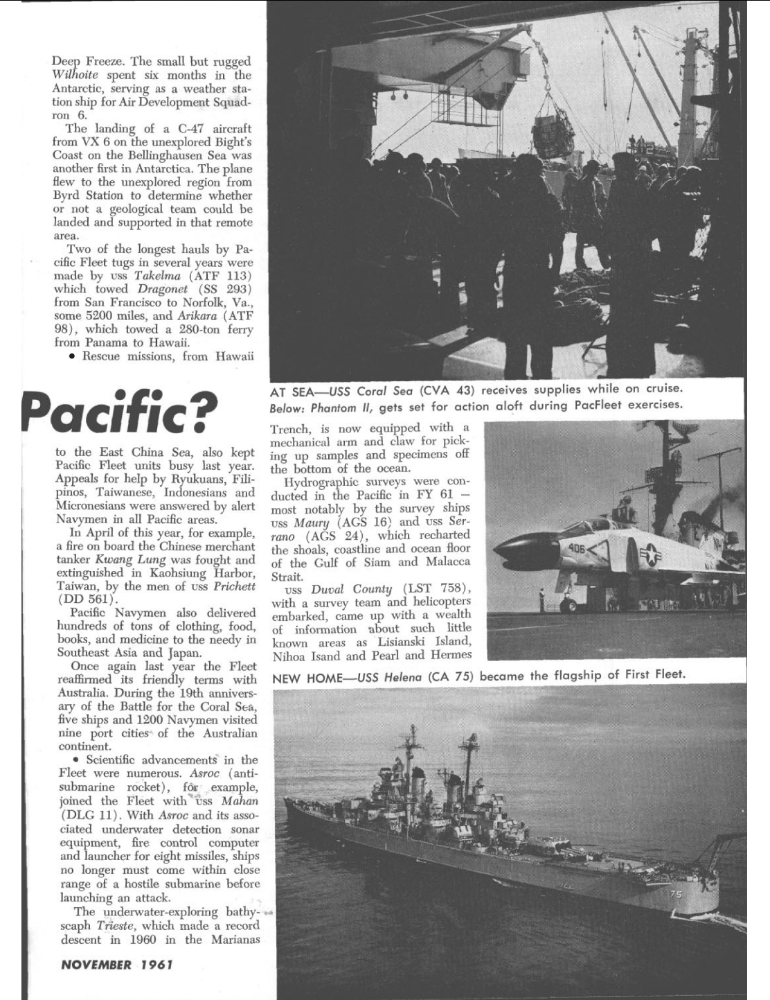 WHAT'S GOING ON IN THE PACIFIC This three page article provides an over view of what was taking place with the US Navy in 1961. The Helena ( CA-75 ) is mentioned both in the text and a photo in the second page