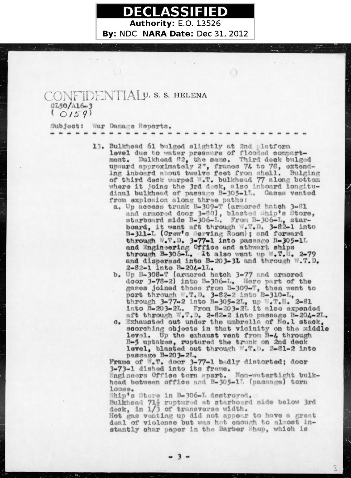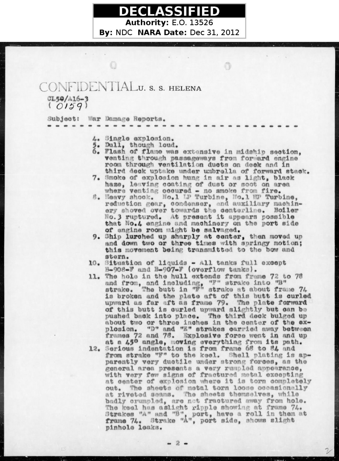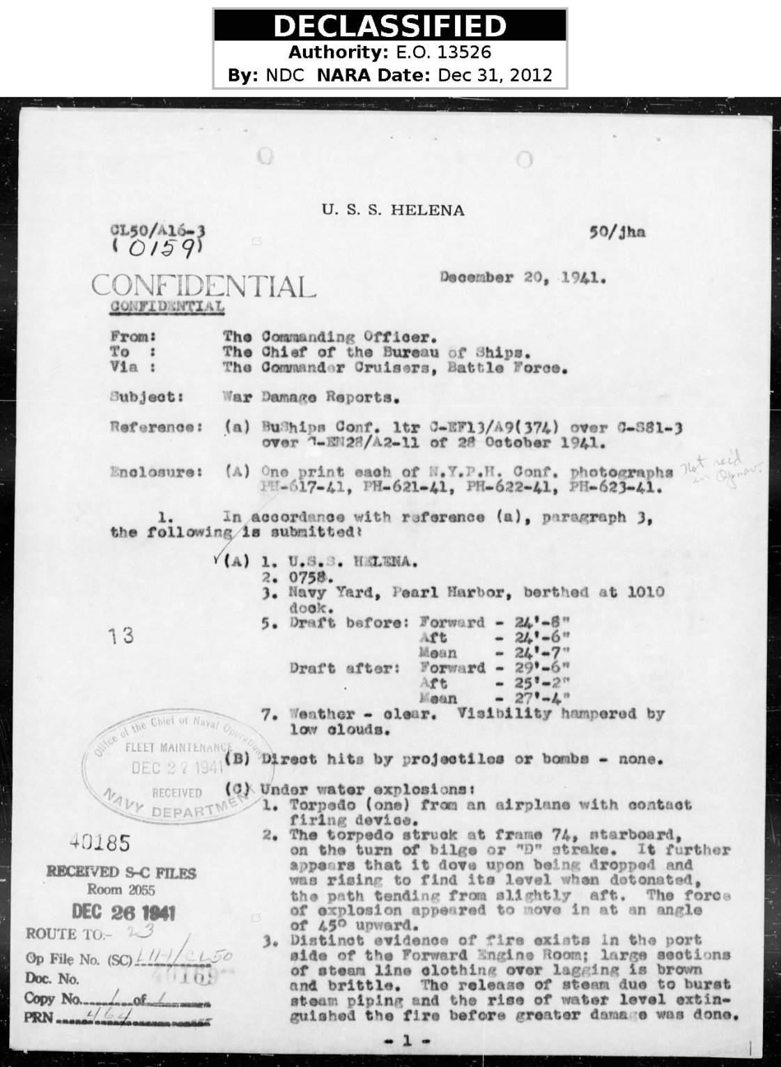 USS Helena at Pearl Harbor 7 December 1941 War Damage Report 20 December 1941