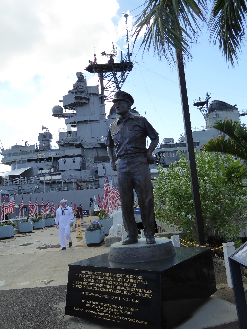 The USS Oklahoma Memorial is a short distance away from the USS Missouri on Ford Island. The Memorial is designed in the shape of the bow of a ship and behind the granite walls are 429 Memorial Markers for each of the men who died 7 December 1941. Since this Memorial was dedicated on 7 December 2007 the remains many of these men have been identified by the DPAA and have been buried across the United States. Each marker is about 6 feet tall and the closeup that I have taken of Lt (jg) Aloysius Schmitt is to honor this man who was Chaplain on board the Oklahoma. The ceremony awarding him the Silver Star can been viewed at: The statue of Fleet Admiral Chester W
