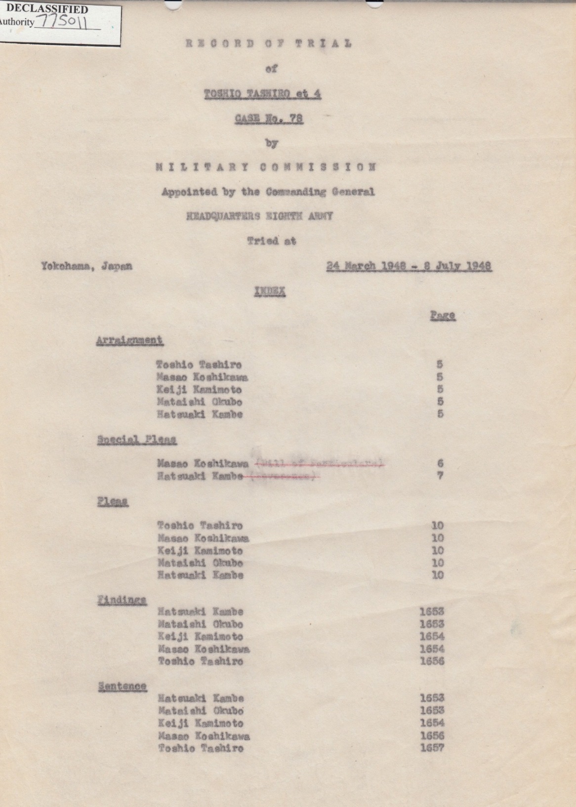 All the remaining documents in this Section are from Michael Krehl who scanned these at NARA. These pages contain a selection of the approximately 1900 pages in the files for Yokohama Trial T-078 It is impossible for me to present each of these documents in the pages of the Yokohama Trial. Very simple information for each of the five accused is presented in their respective pages