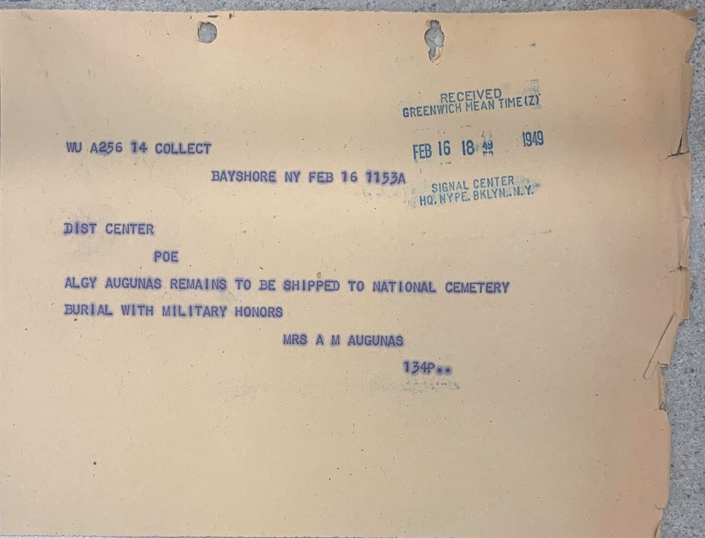 TELEGRAM TO DISTRIBUTION CENTER #1 FROM MRS STELLA AUGUNAS 16 FEBRUARY 1949
