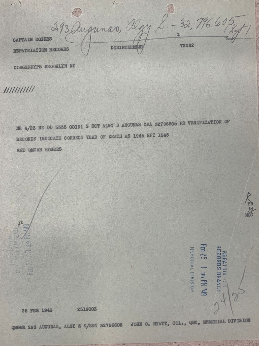 The documents on this page contain correspondence concerning the engraving on SSgt Algy S Augunas' urn.