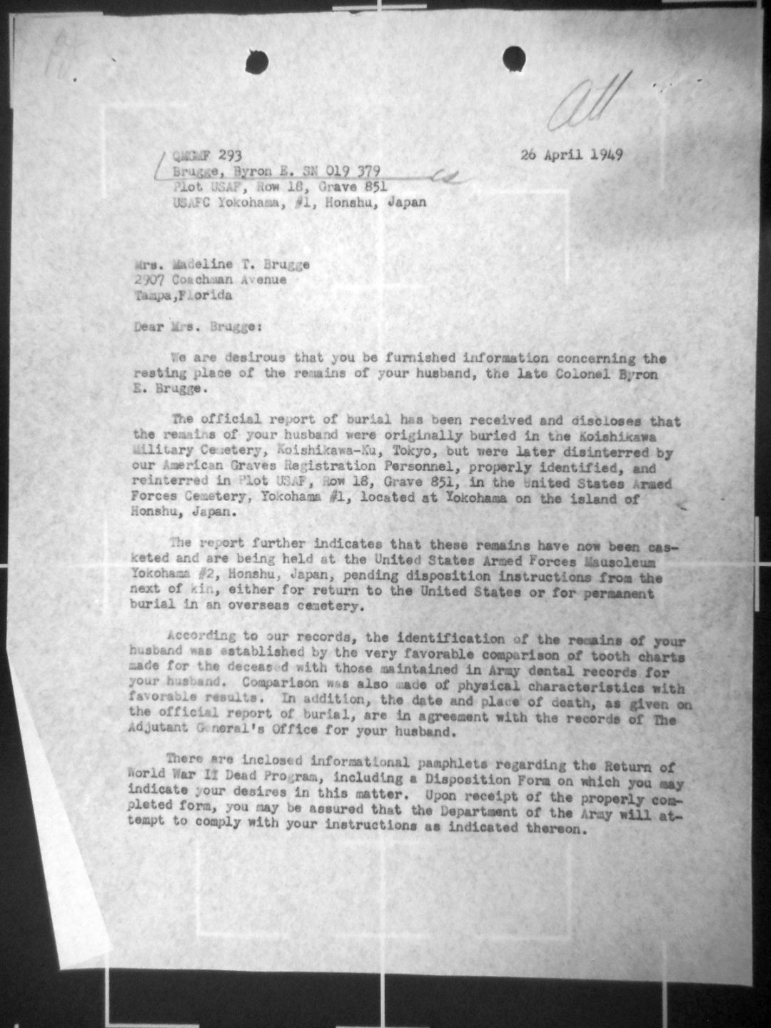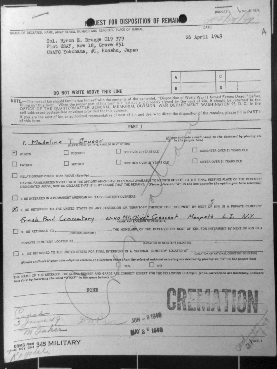 The documents in these two pages cover the period from April through September 1949 and concern Col Brugge's remains being transfered from Japan to New York. His wife, Mrs. Madeline Tinker Brugge, was sent requests as to how she wished his remains to be handled. There is correspondence between Mrs. Brugge and the Graves Registration Service concerning her request that he be cremated. The remaing documents deal with his return home. He was transported to either Fort Mason, San Francisco or the Oakland Army Terminal, by the US Army Transport General Nelson M Walker and then by rail to New York. |