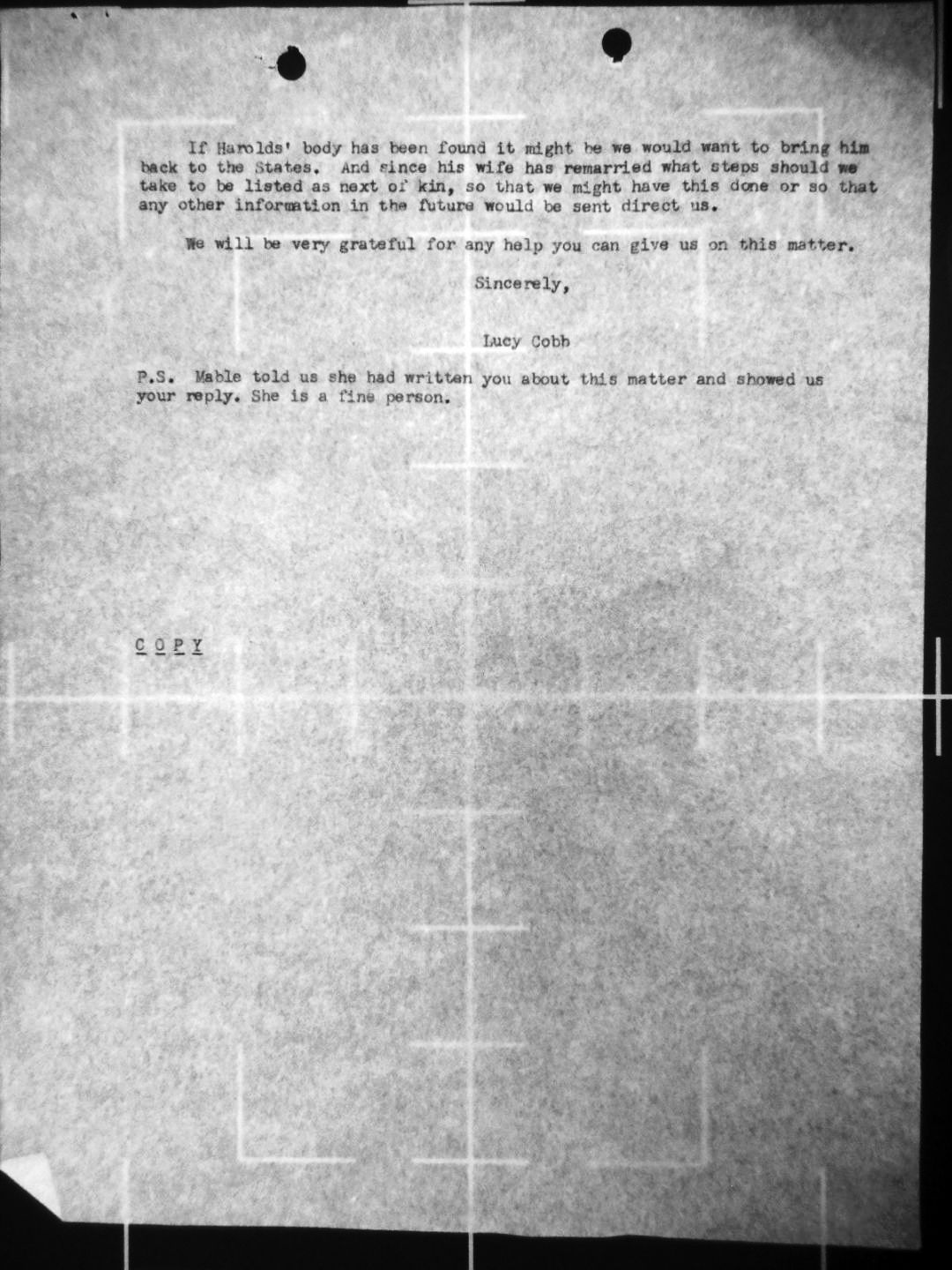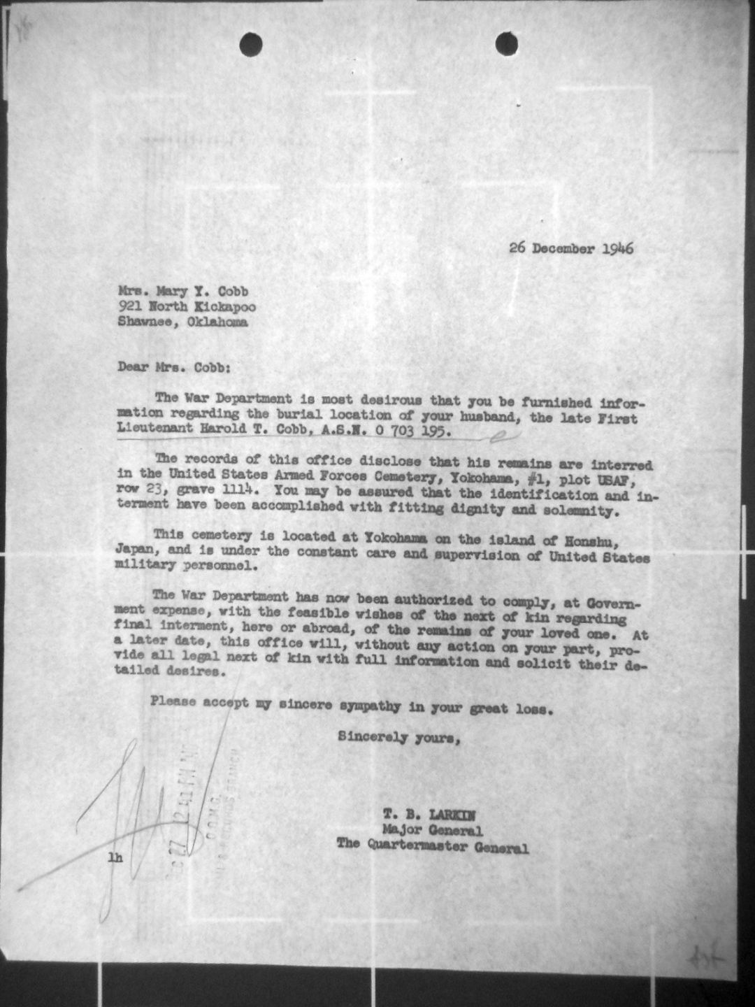 26 DECEMBER 1946 MAJOR GENERAL LARKIN, QUARTERMASTER GENERAL, TO MARY Y COBB
