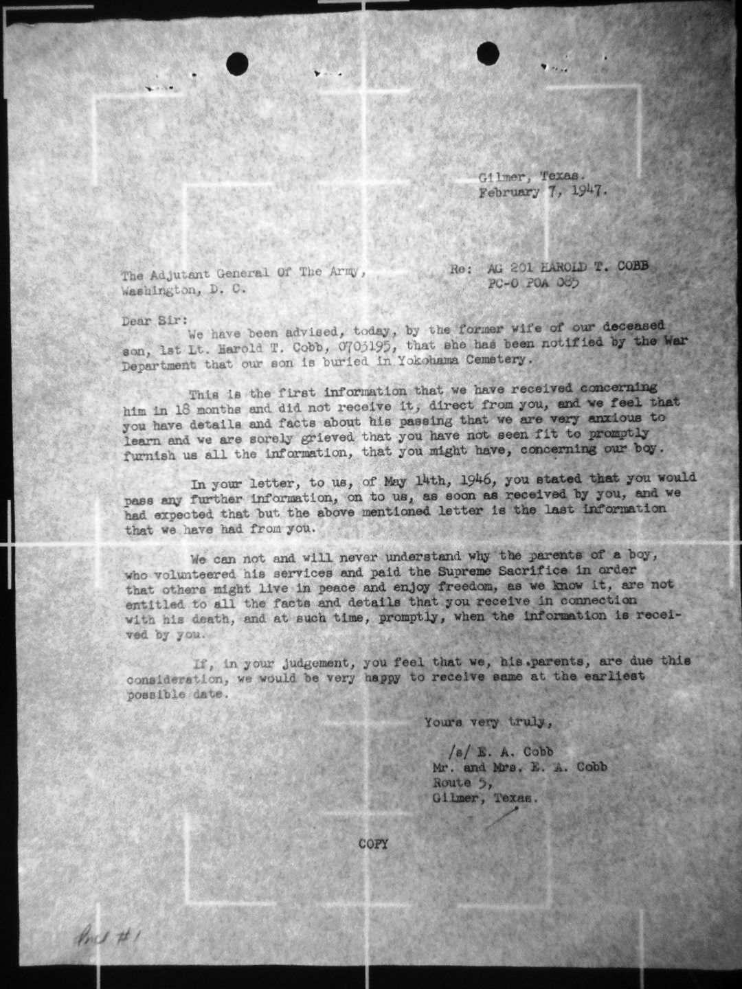 7 FEBRUARY 1947 ERWIN A COBB TO ADJUTANT GENERAL OF THE ARMY
