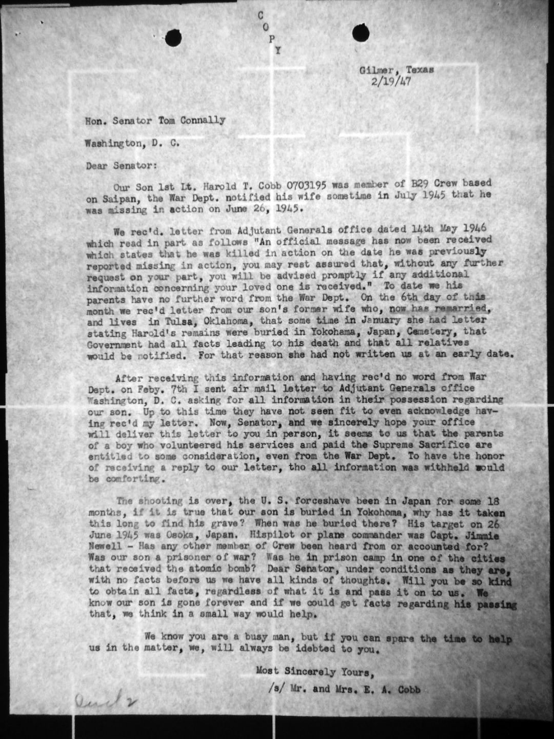 19 FEBRUARY 1947 MR AND MRS E.A. COBB TO SENATOR TOM CONNALLY
