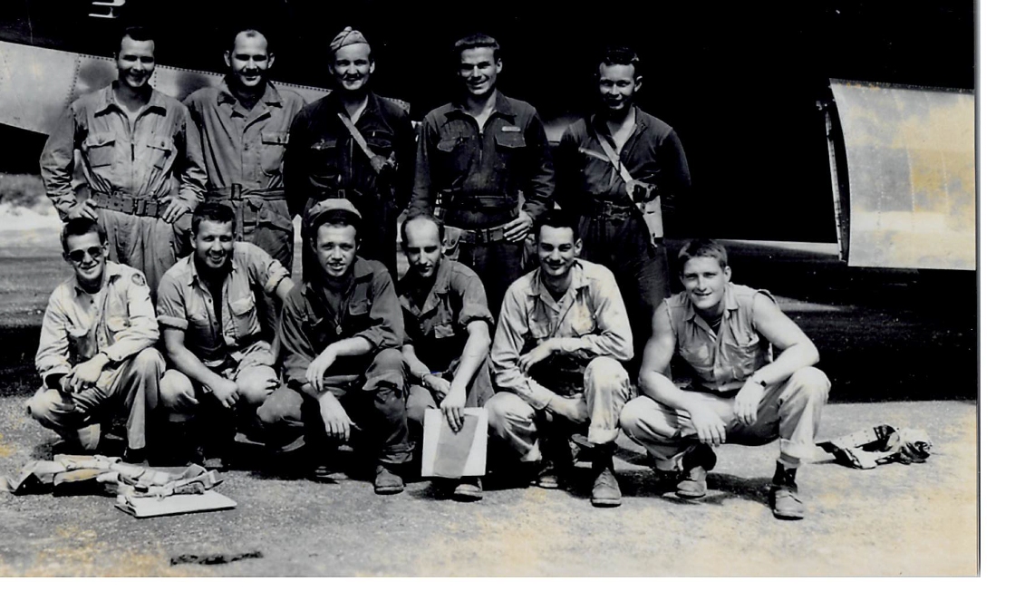 On this page are TSgt Copulos' Registration Cards and a photo of the Newell Crew taken on Saipan. The back of this picture has the names . TSgt Copulos is kneeling and second from the left. In the second page is another photo of the Newell crew taken at a debriefing on Saipan and two documents |
