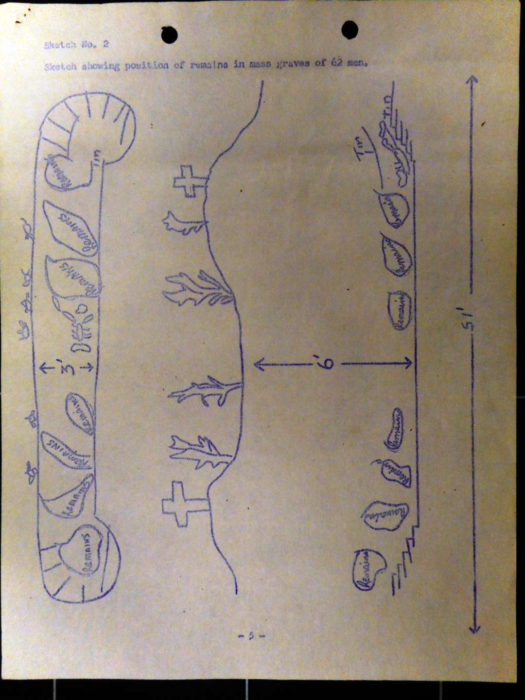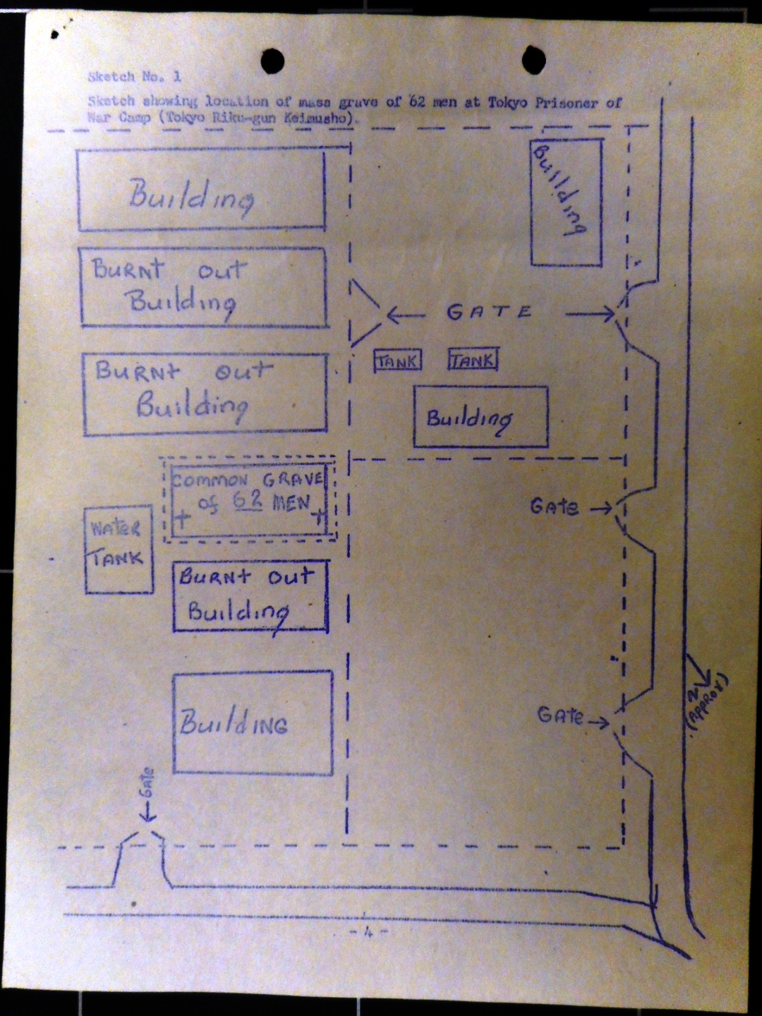 SKETCH NUMBER 1 DRAWING OF BUILDINGS AND LOCATION OF MASS GRAVE OF 62 MEN