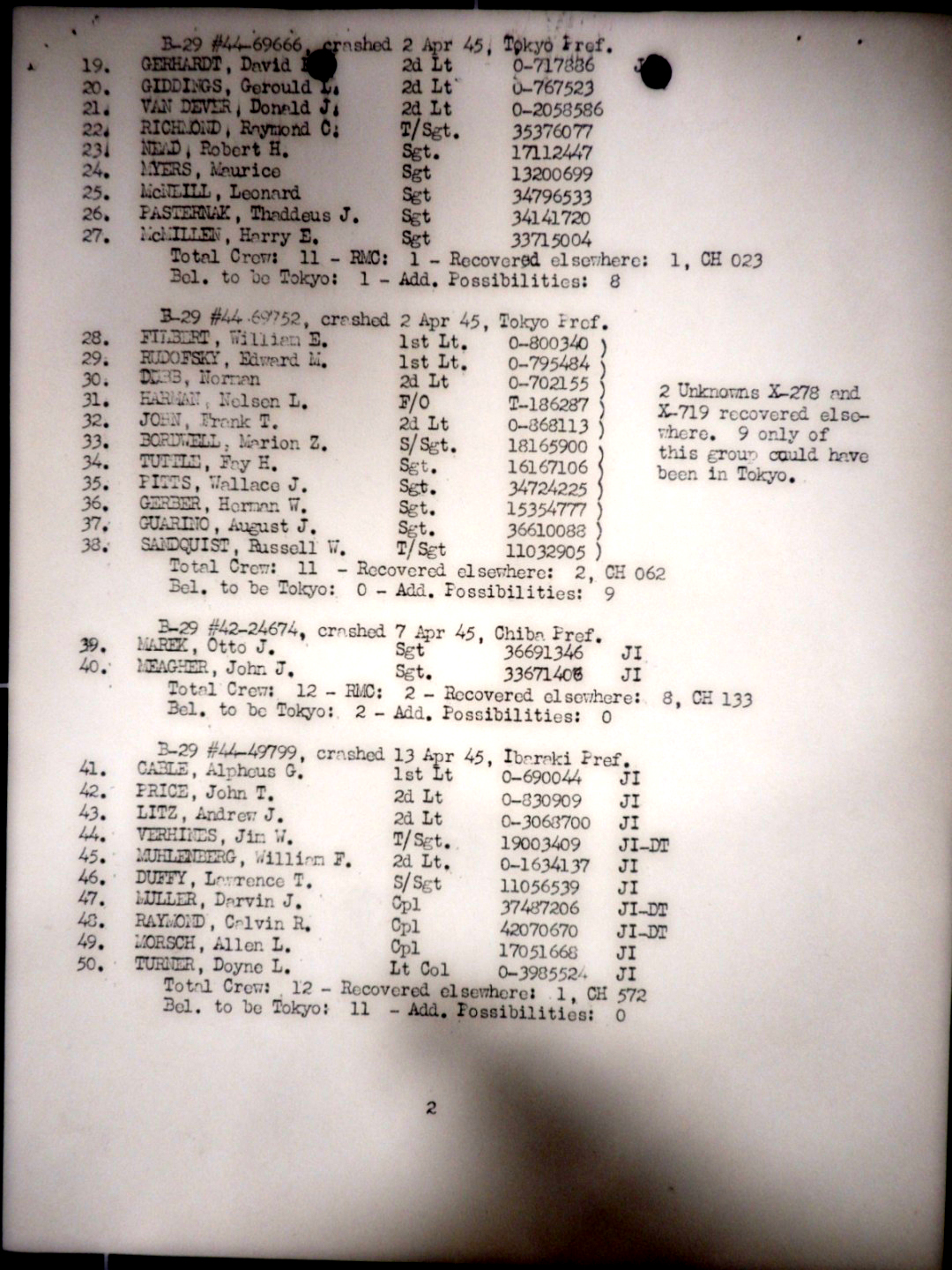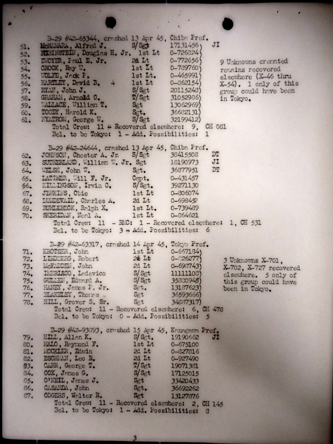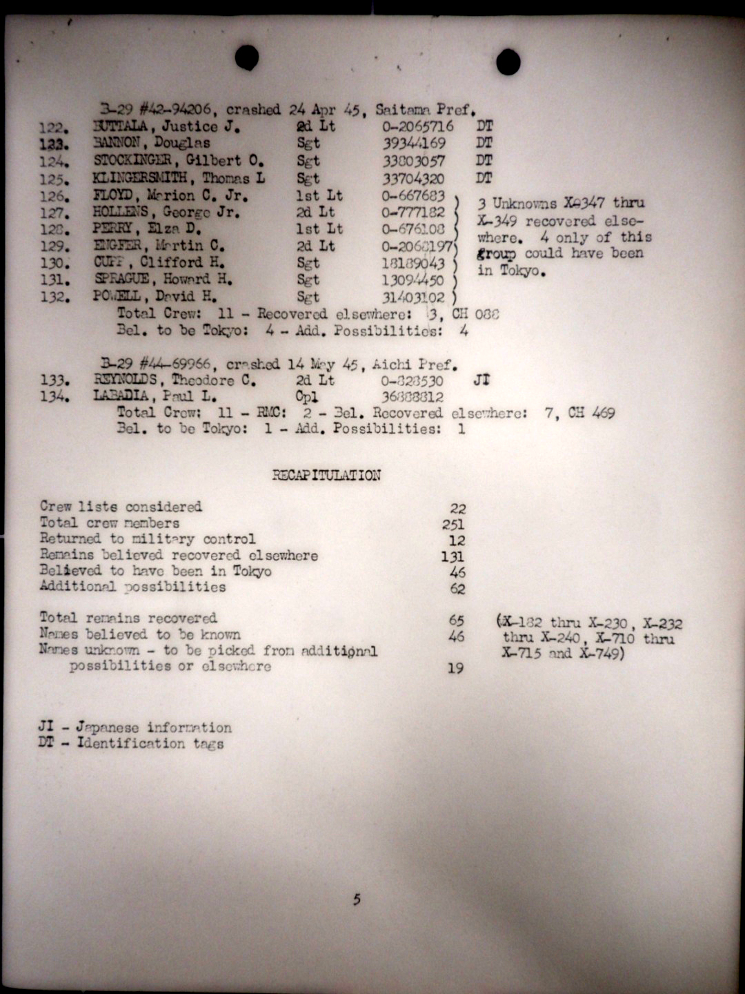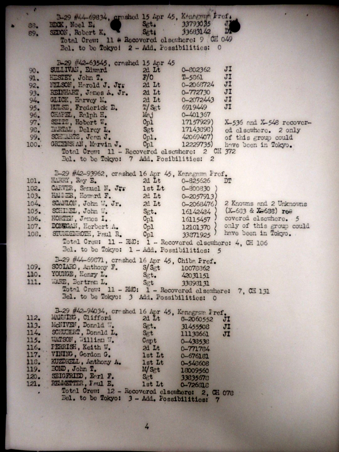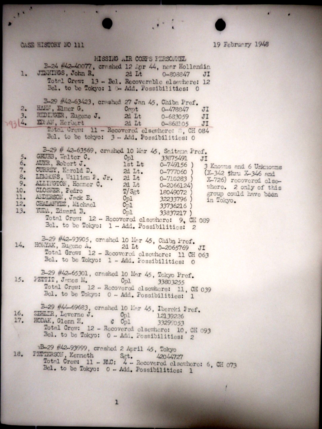 This list would have been compiled by going through several documents, such as the Missing Air Crew Reports, in an attempt to determine who could have been in the Tokyo area. Efforts were made to narrow down this list to the most probable. The list is organized by each B-29 that was lost and the crew members who were known to have survived. Capt Hahn, Lt Redinger , and Lt Edman are numbers 2,3, and 4 In the Recapitulation at the bottom of the last page are statistics to summarize the information in this list of 134 men. |