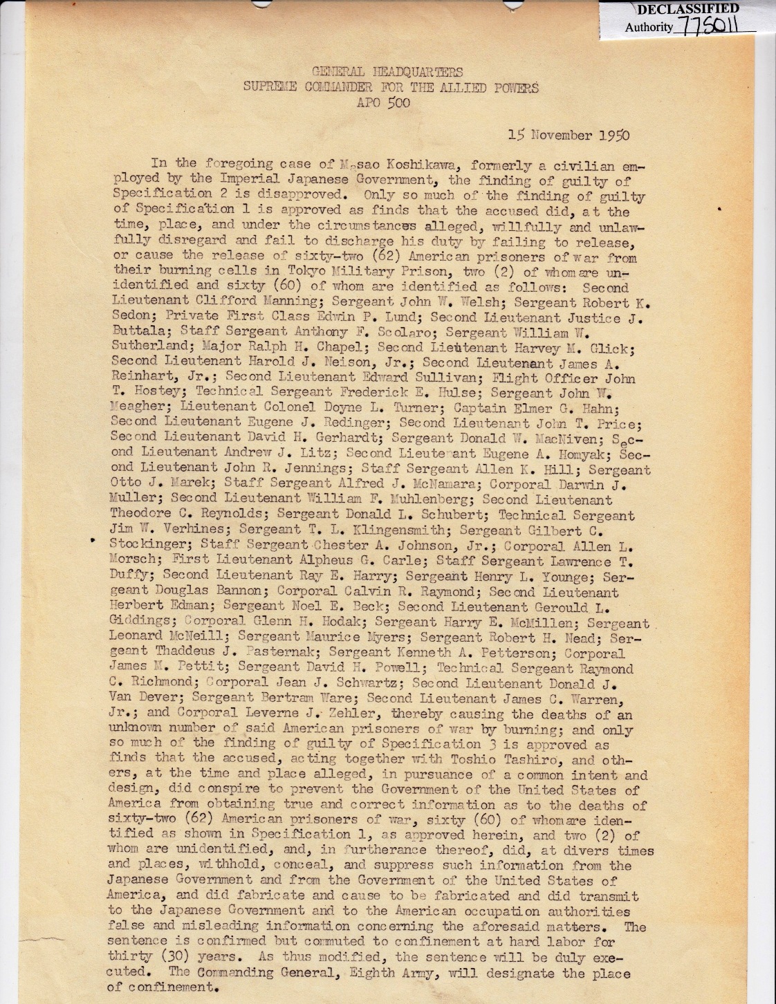 The sketch at the top shows the layout of the Tokyo Military Prison. This is followed by a letter signed by General MacArthur concerning
