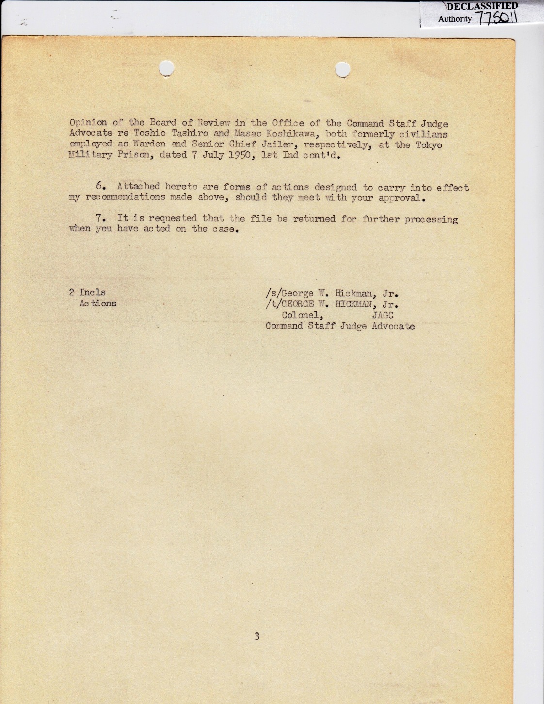 Supreme Commander Allied Powers. The Board recommends that the sentence of death for Tashiro be confirmed . The Board recommends that the sentence for Koshikawa be commuted to confinement at hard labor for 30 years. source: Michael Krehl |