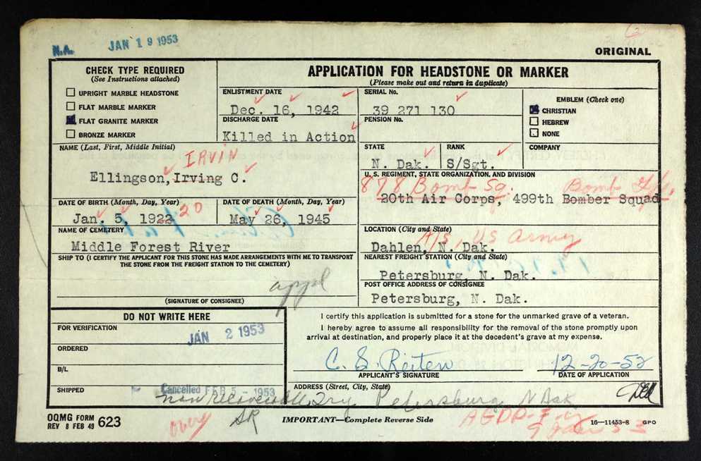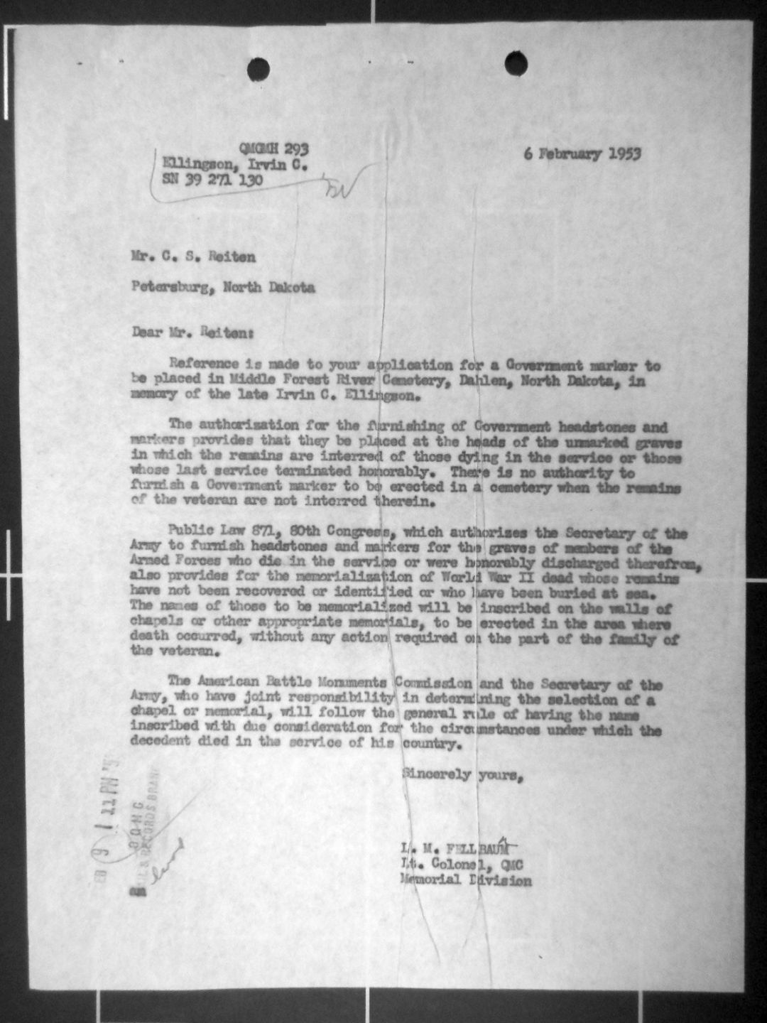 on Following this application is a letter from the QMC denying this request. Sometime after 1953 the law(s) were changed to allow Memorial Markers to be placed in cemeteries. |