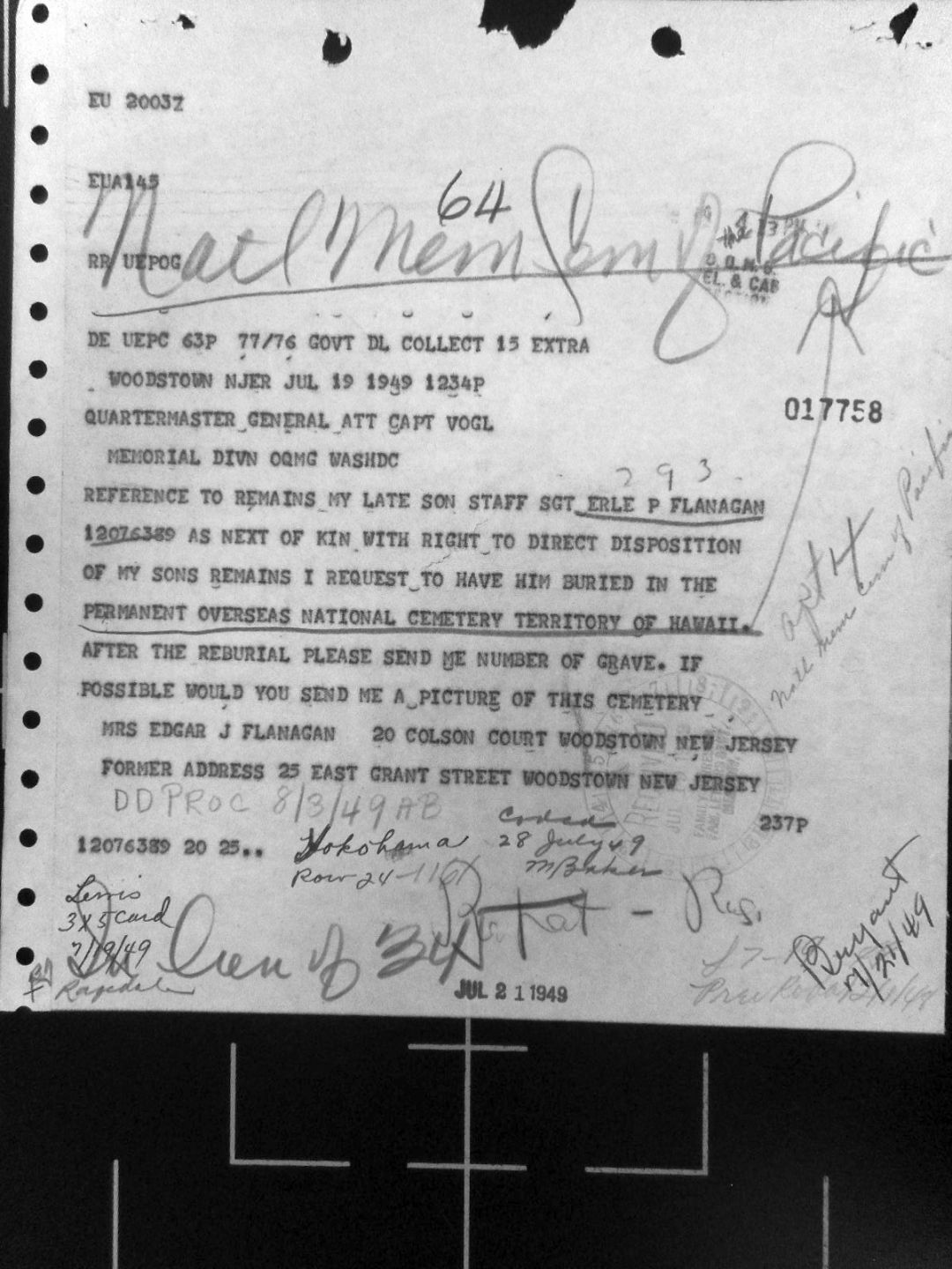 TELEGRAM FROM MRS EDGAR J FLANAGAN TO QUARTERMASTER GENERAL 19 JULY 1949 REQUEST TO HAVE HER SON BURIED IN NATIONAL CEMETERY, TERRITORY OF HAWAII