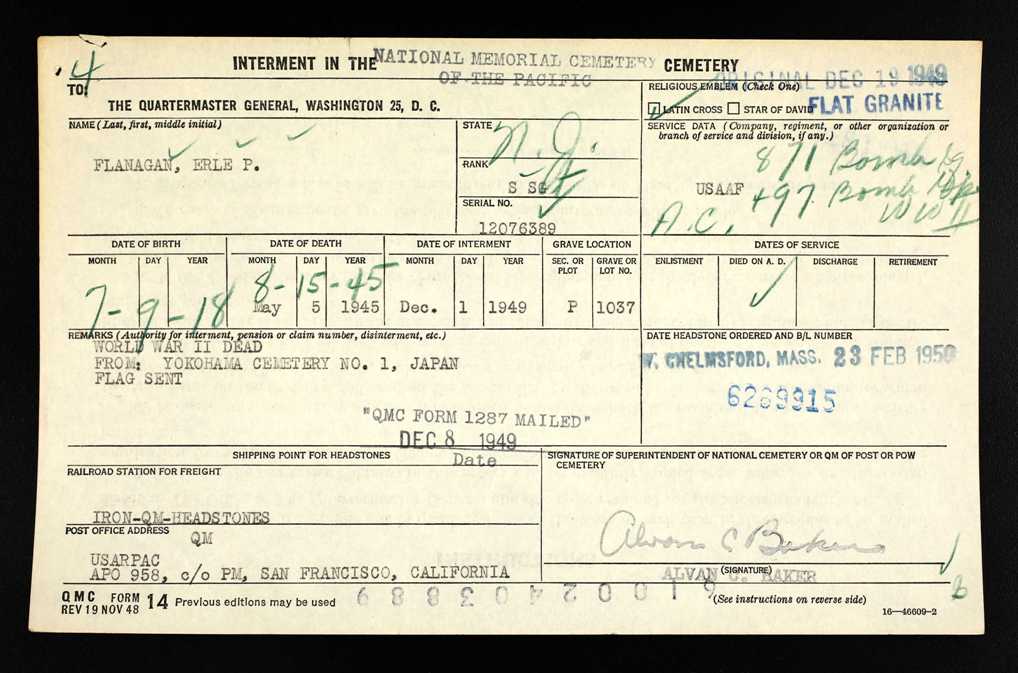 SSGT ERLE P FLANAGAN INTERMENT CONTROL CARD DATE OF INTERMENT : 1 DECEMBER 1949