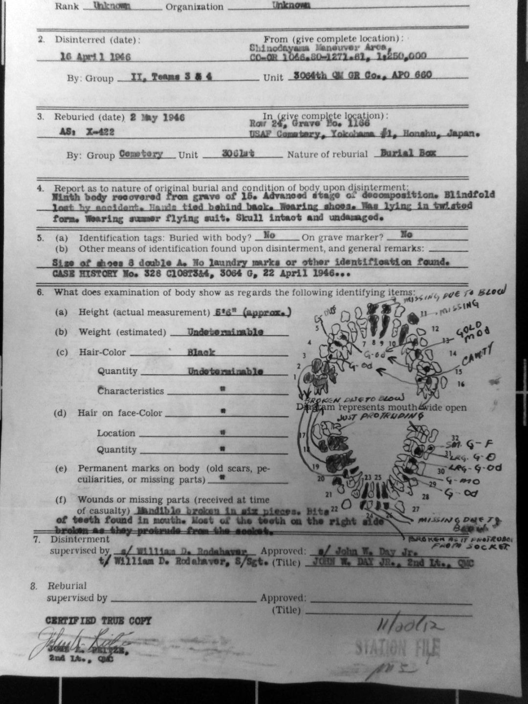 The below four pages are intended for those who wish a minimal number of documents concerning identification of 2nd Lt Harry J Foley. The first is dated 22 April 1946 with initial disinterment taking place 16 April 1946. His remains were recovered from a grave in the Throughout the pages in Parts 1, 2, and 3 you will encounter references to Lt Foley being the 9th body recovered. The last page establishes formal approval of his identification, dated 4 May 1949.