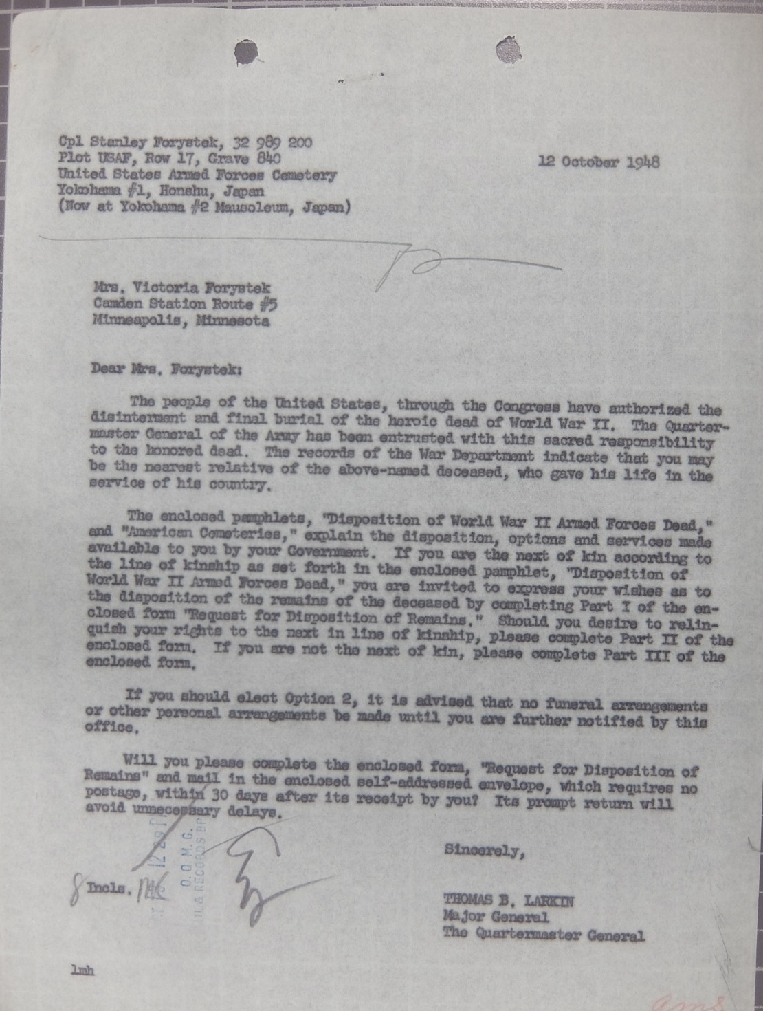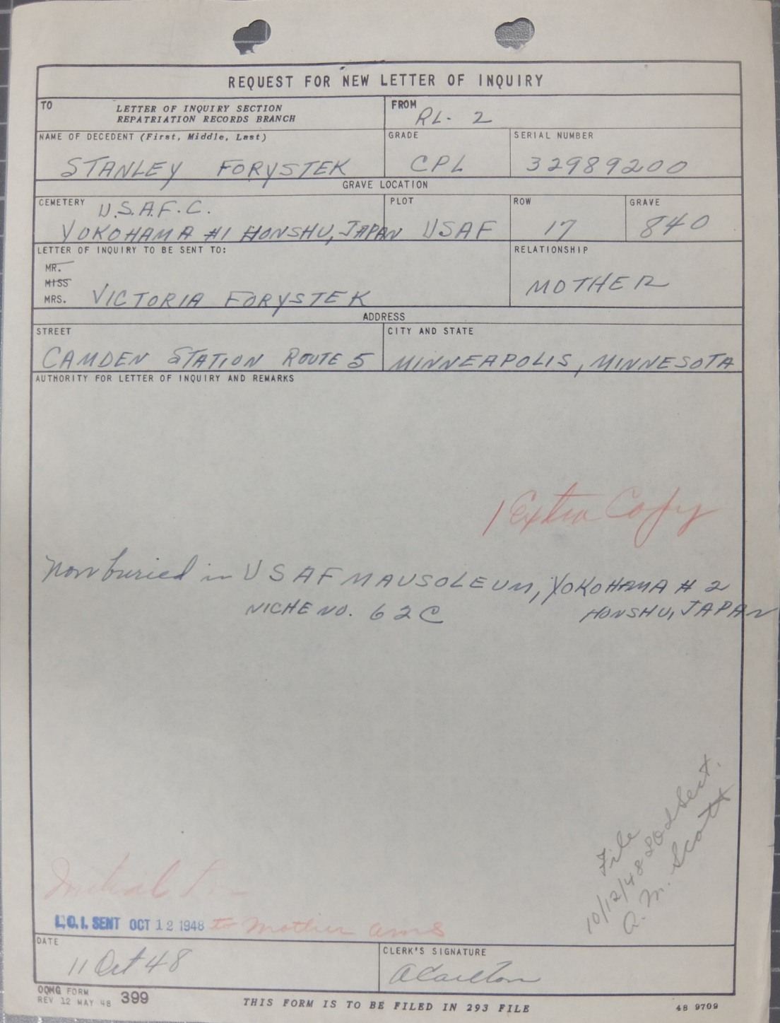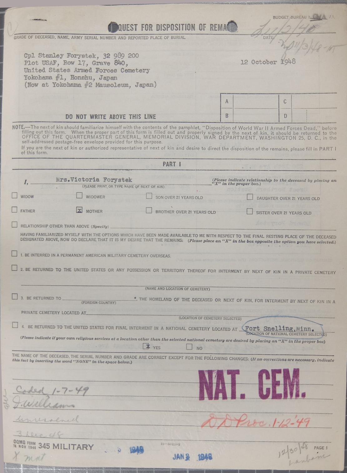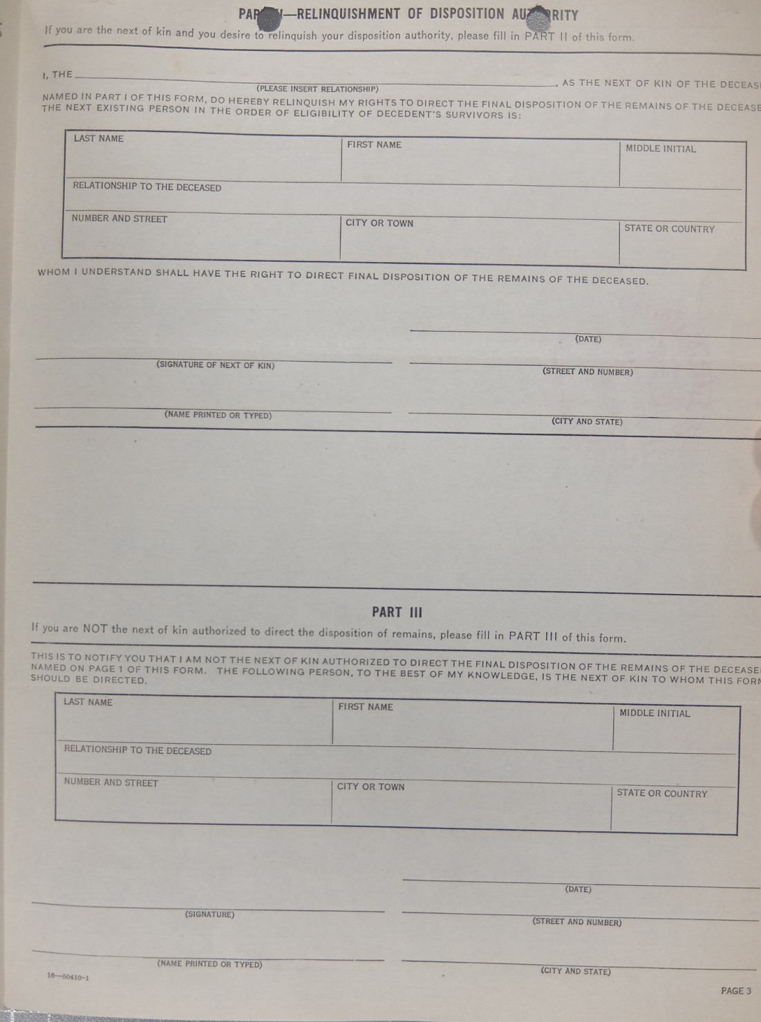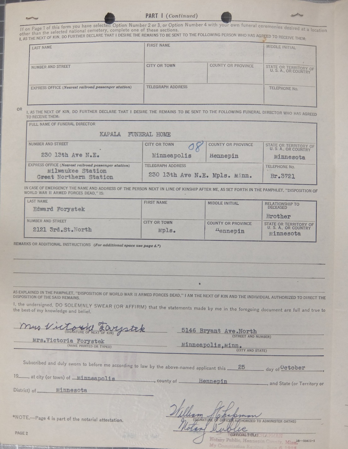 Mrs Forystek filled out the form Request for Disposition of Remains