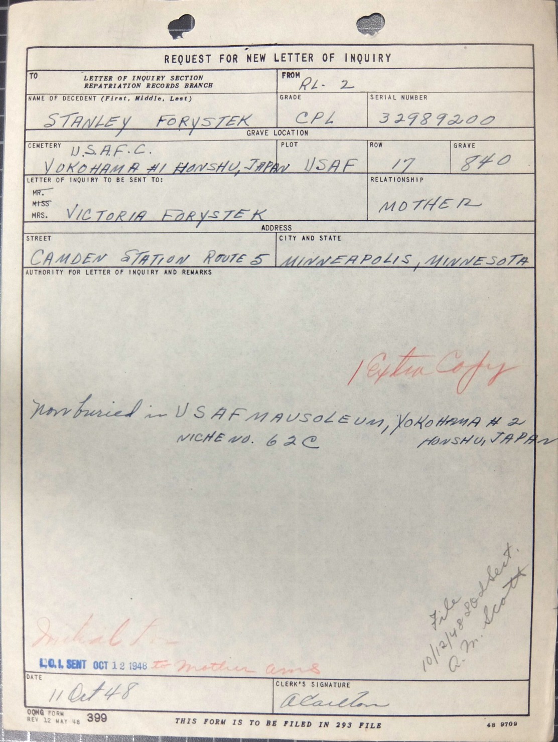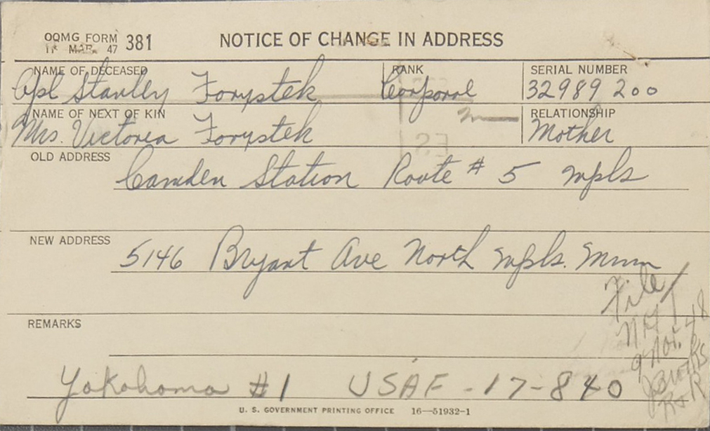 Cpl Forystek's father died in October 1944 and his mother at