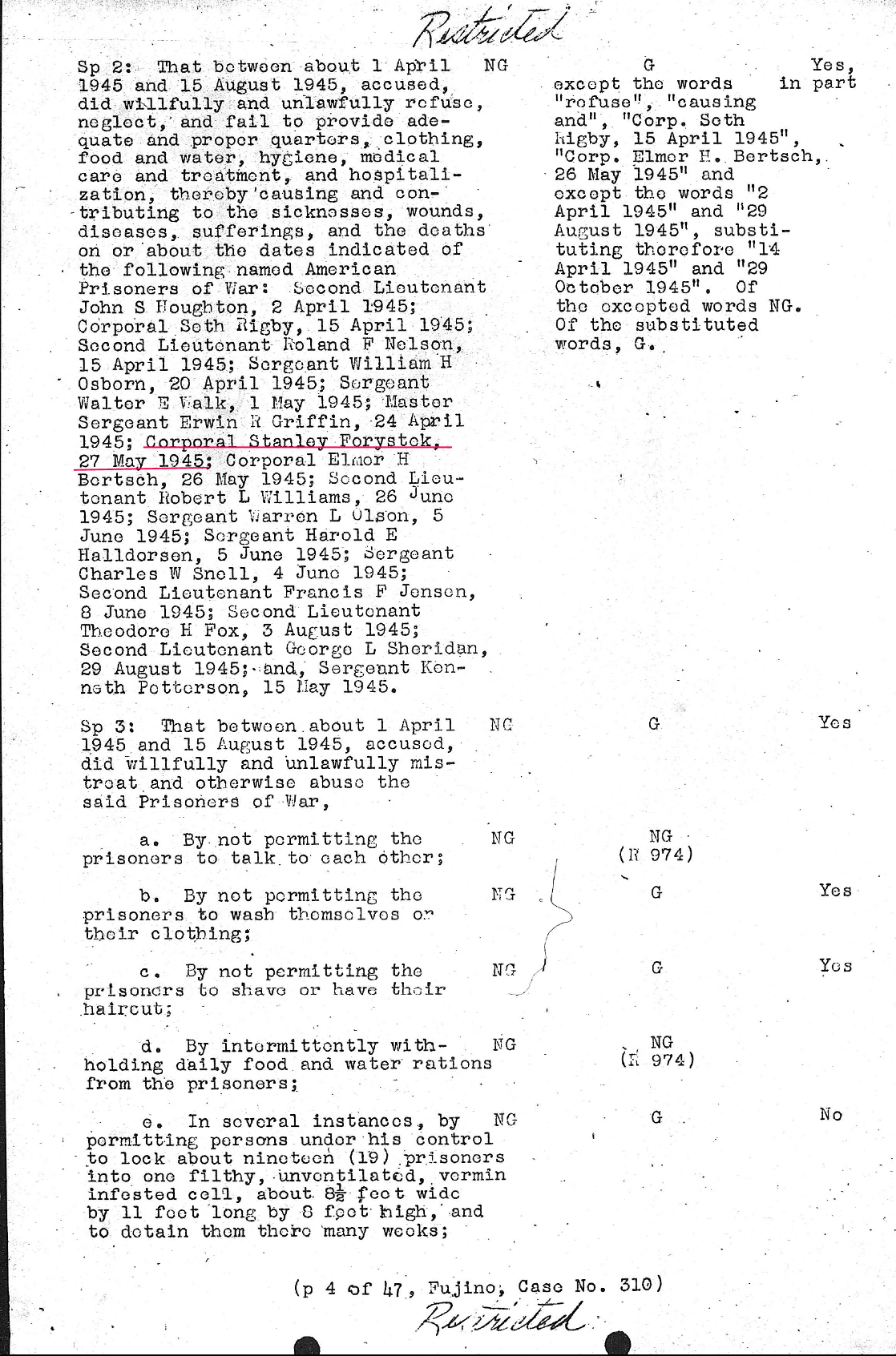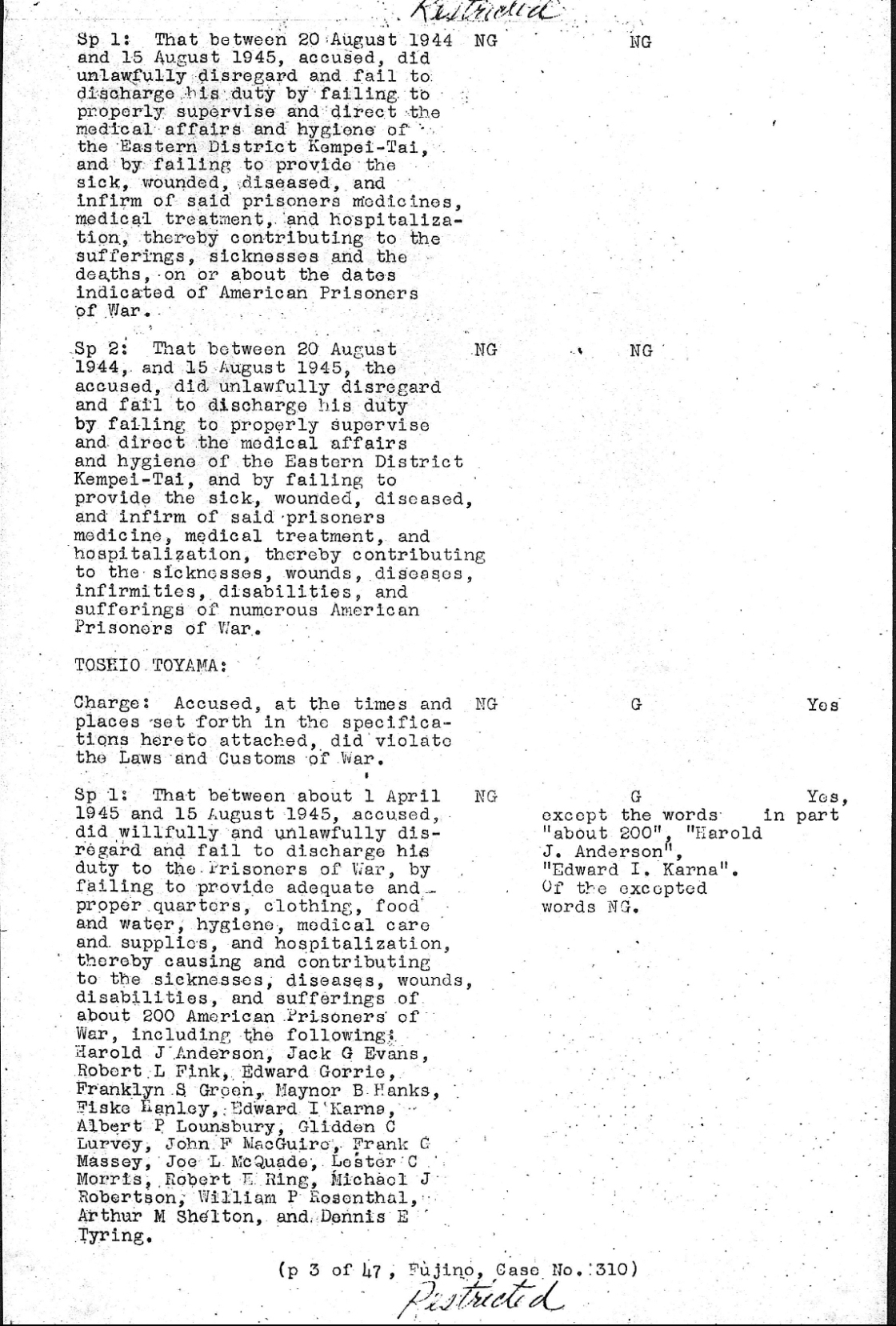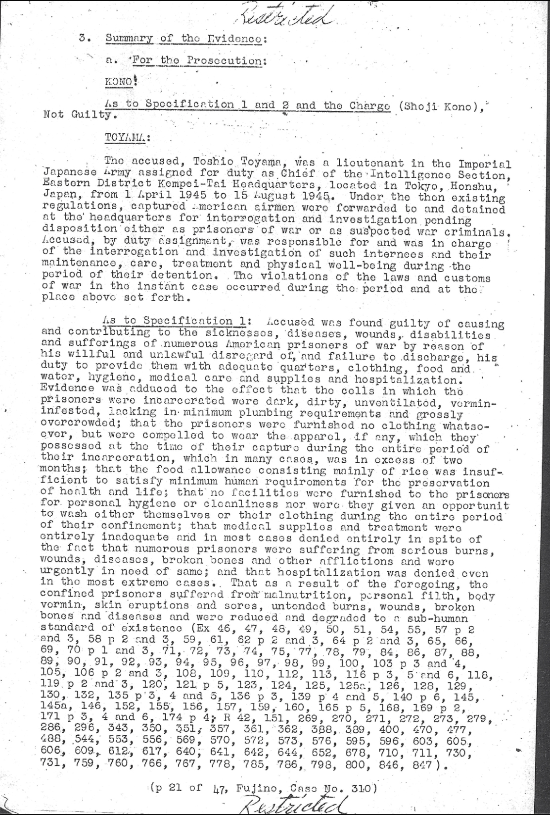 The accused Toyama is the focus of these pages. His name first appears in PAGE 3. Cpl Forystek's name appears in Sp 2 ( Specification 2 ) in PAGE 4 The Summary of Evidence begins on Trial PAGE 21 with Toyama the second name on the page. Toyama and Specification 2 are in PAGE 22. Toyama is essentially accused of failing to provide adequate medical treatment for 14 of the POWs. Cpl Stanley Forystek is the first name in this list. |
