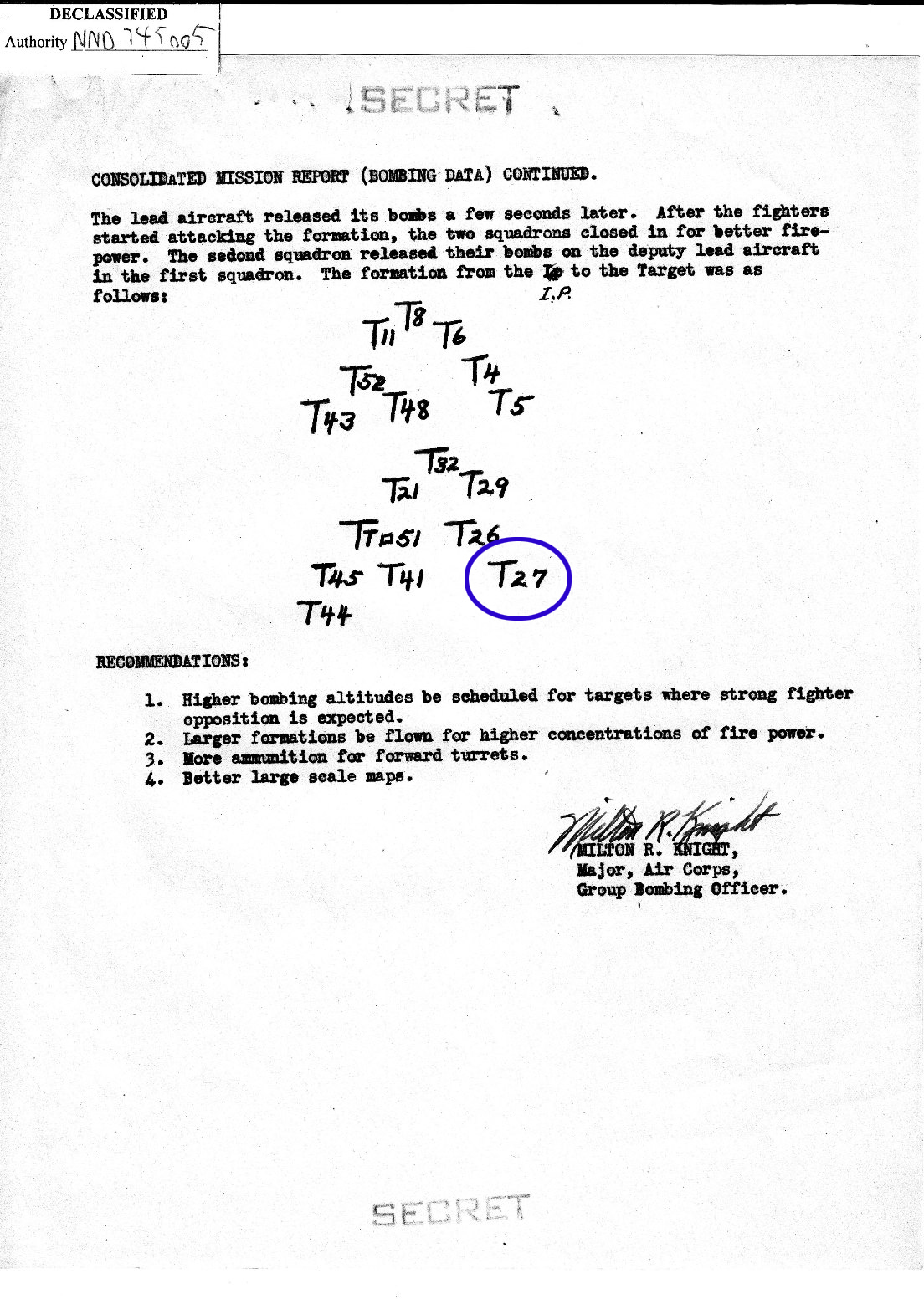 Two of the below pages are from the Bombing Data concerning the 499th Bomb Group section of the complete mission report. In the third page is a formation diagram. The 499th Bomb Group aircraft identification is the letter V B-29 42-24769 is V-27 In both the first and second pages V-27 is underlined in blue.