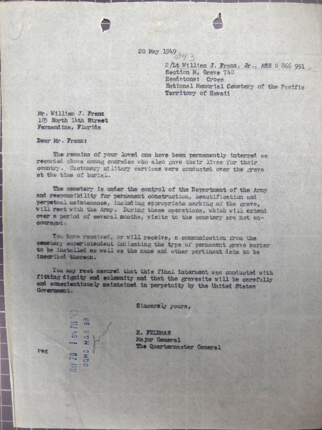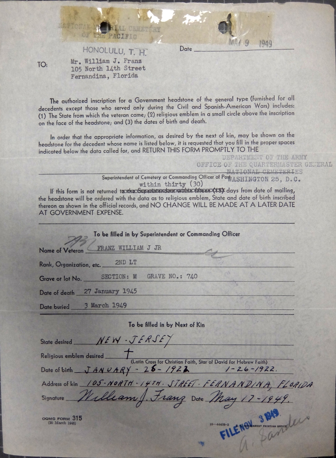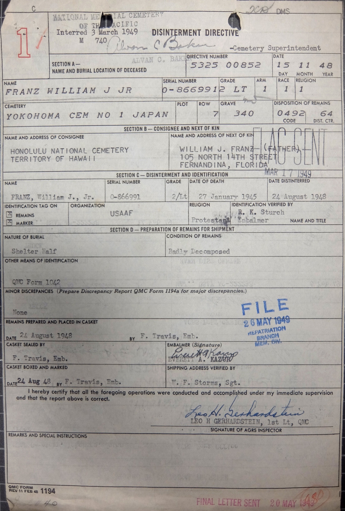2nd Lt William Joseph Franz, Jr's , journey home began
