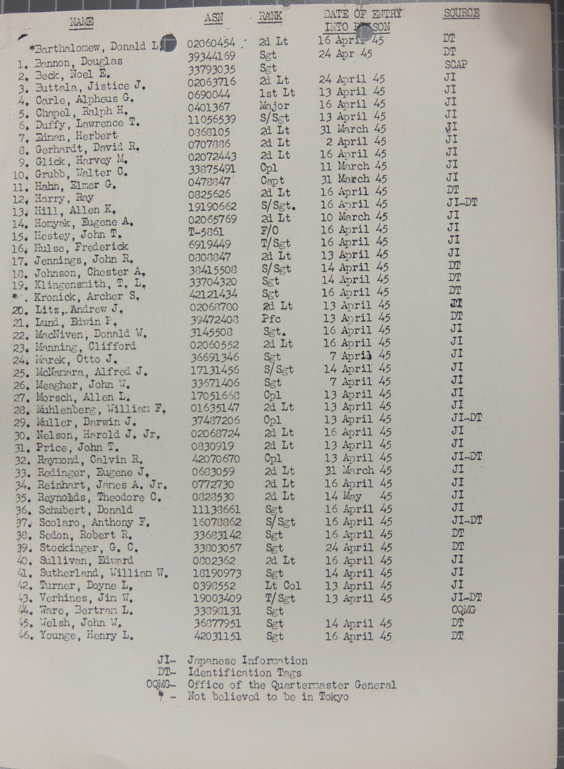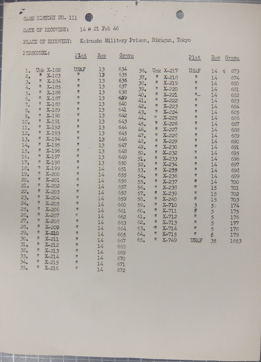 The first has 65 X - NUMBERS and is dated 14 February 1946. The second list contains 46 names and date of entry into the Tokyo Military Prison. In some documents within the Individual Deceased Personnel Files you will see the word ' identified ' associated with these names. Technically, this is not correct as the names are those of POWs who had a high probability of being in the prison on the night of 25-26 May 1945. Of the 62 POWs who died in the fire, 37 remain unidentified. |