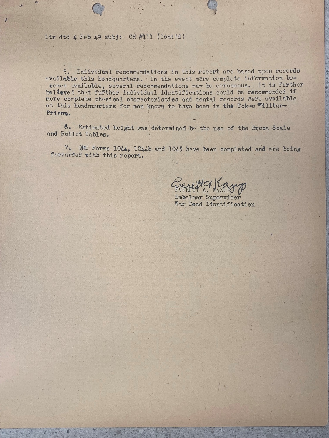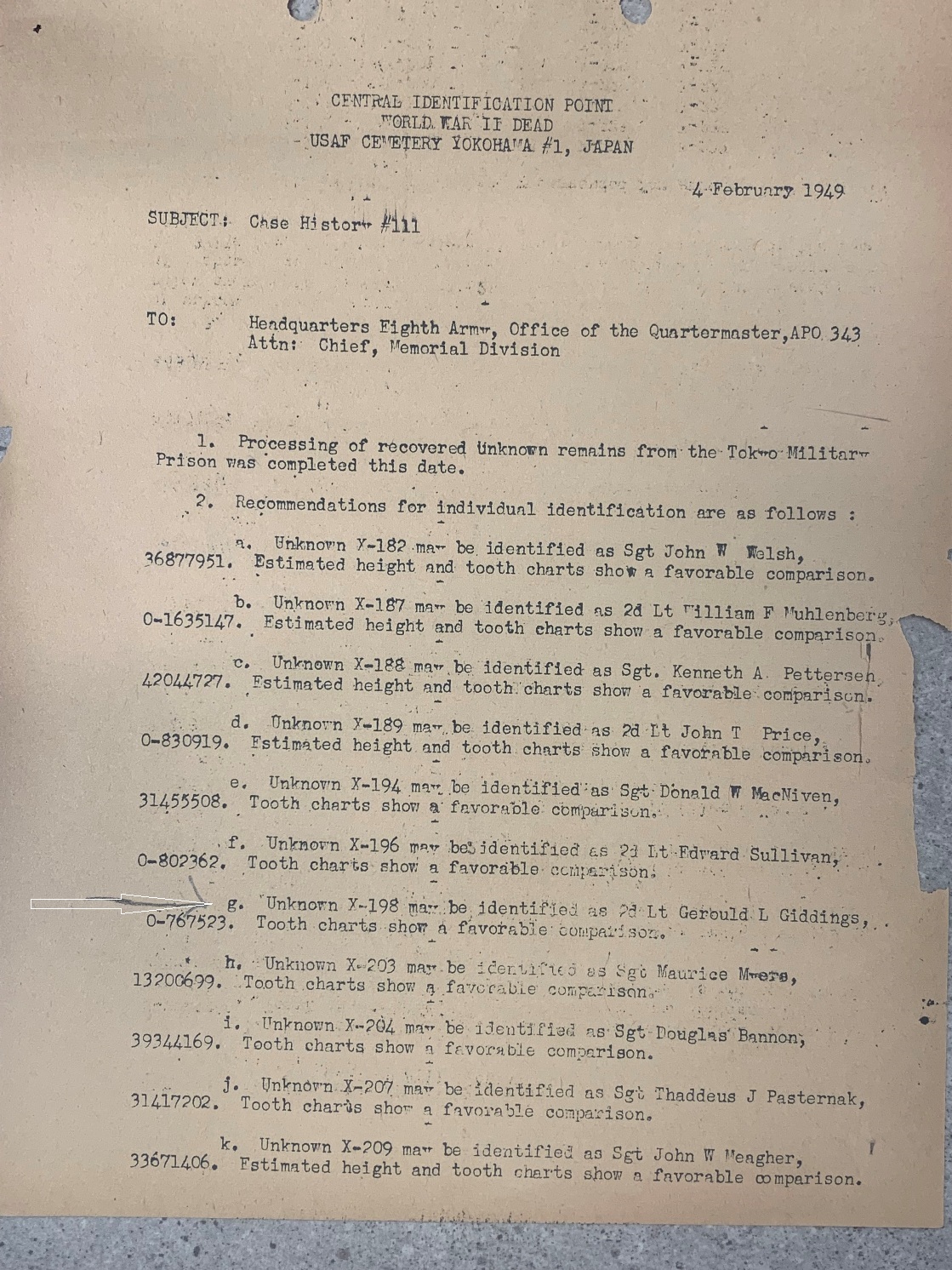 The Central Identification Point Laboratory at The recommendation for Lt Giddings' identification is in Paragraph 2.g. This is followed by the remaining two pages of the document. |