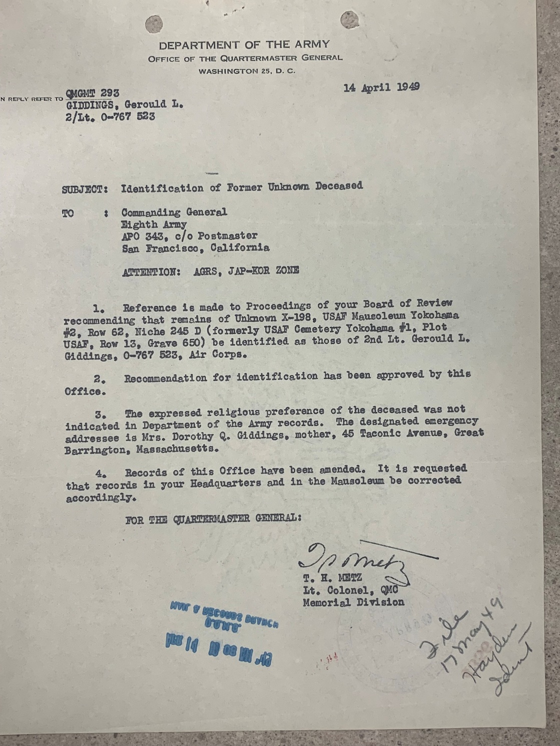 On 14 April 1949, the Department of the Army accepted A corrected Report of Interment was issued 4 May 1949. |