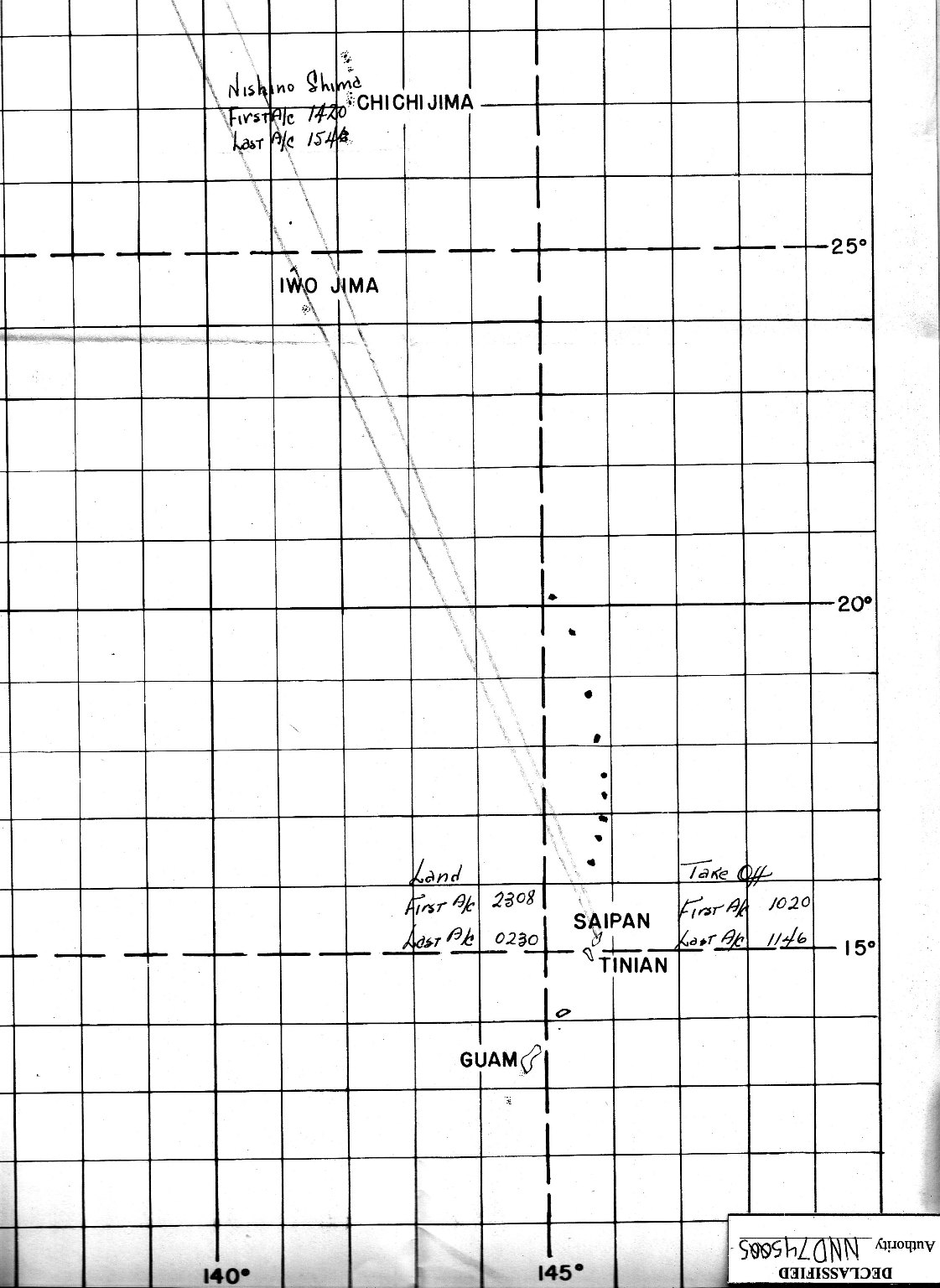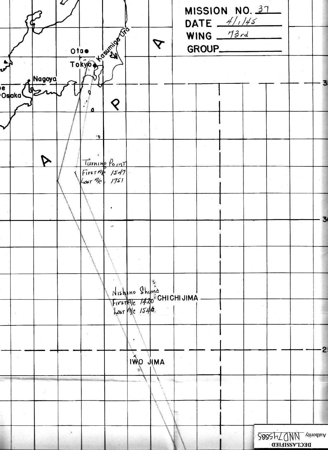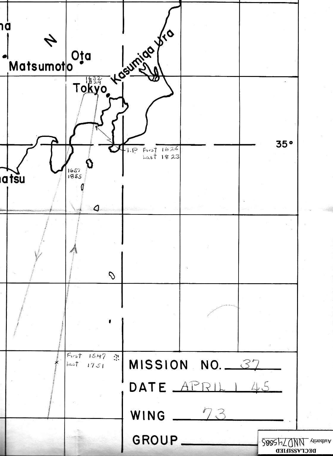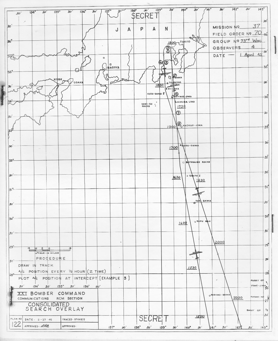 The first was used by the Radar Countermeasure ( RCM ) B-29s. Note that 4 RCM Officers were on this mission. The second chart is split into three sections : The first plots the track from Saipan to Iwo Jima and the second from Iwo Jima / Chichi Jima to Tokyo. Last is a close-in view of the route flown to and from the target. The IP ( Initial Point ) is the location where each B-29's Bomb Run would start. These B-29s bombed individually rather than in formation and the spacing of the 120 aircraft can be seen with the difference between times of first and last aircraft. |