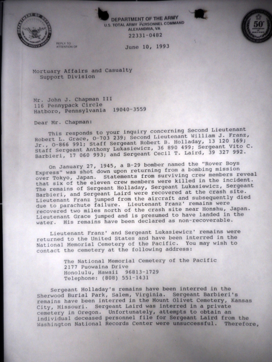 below is a letter written to Mr Chapman in 1993.