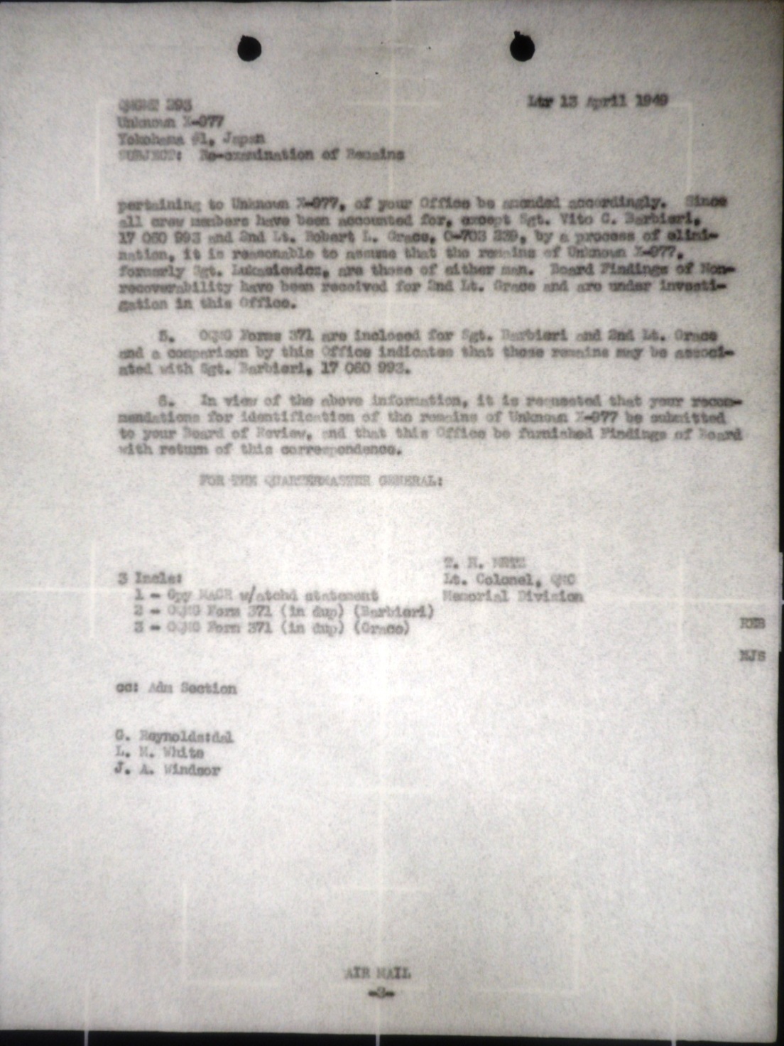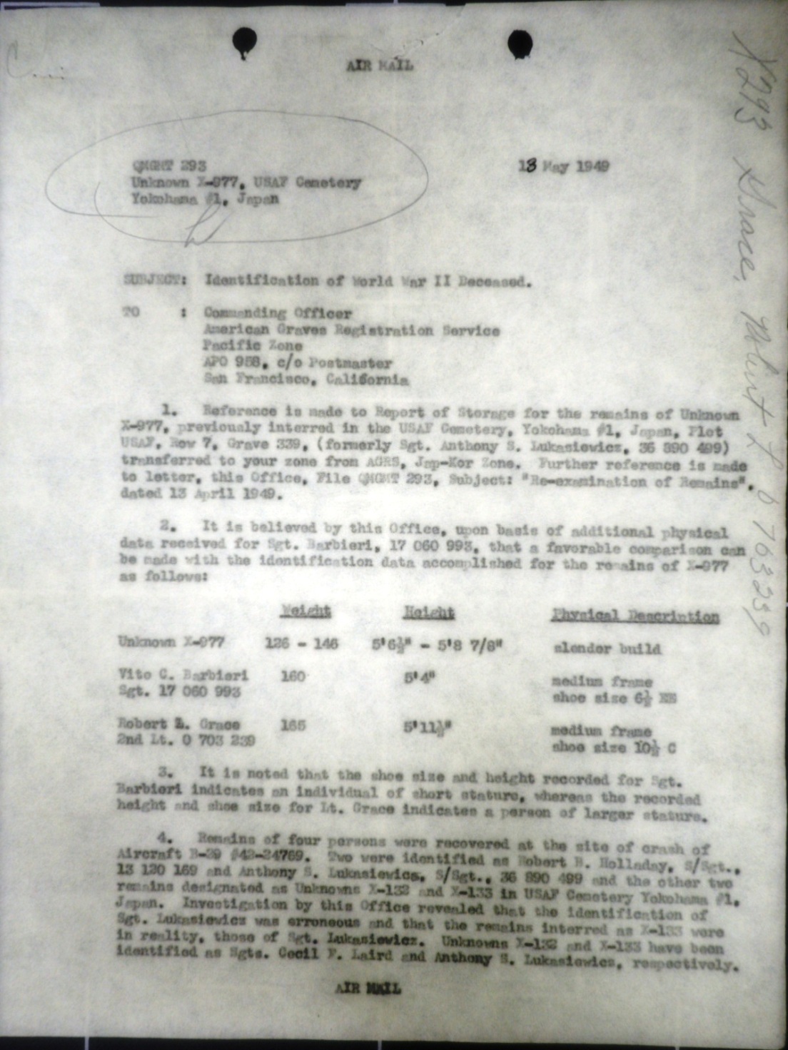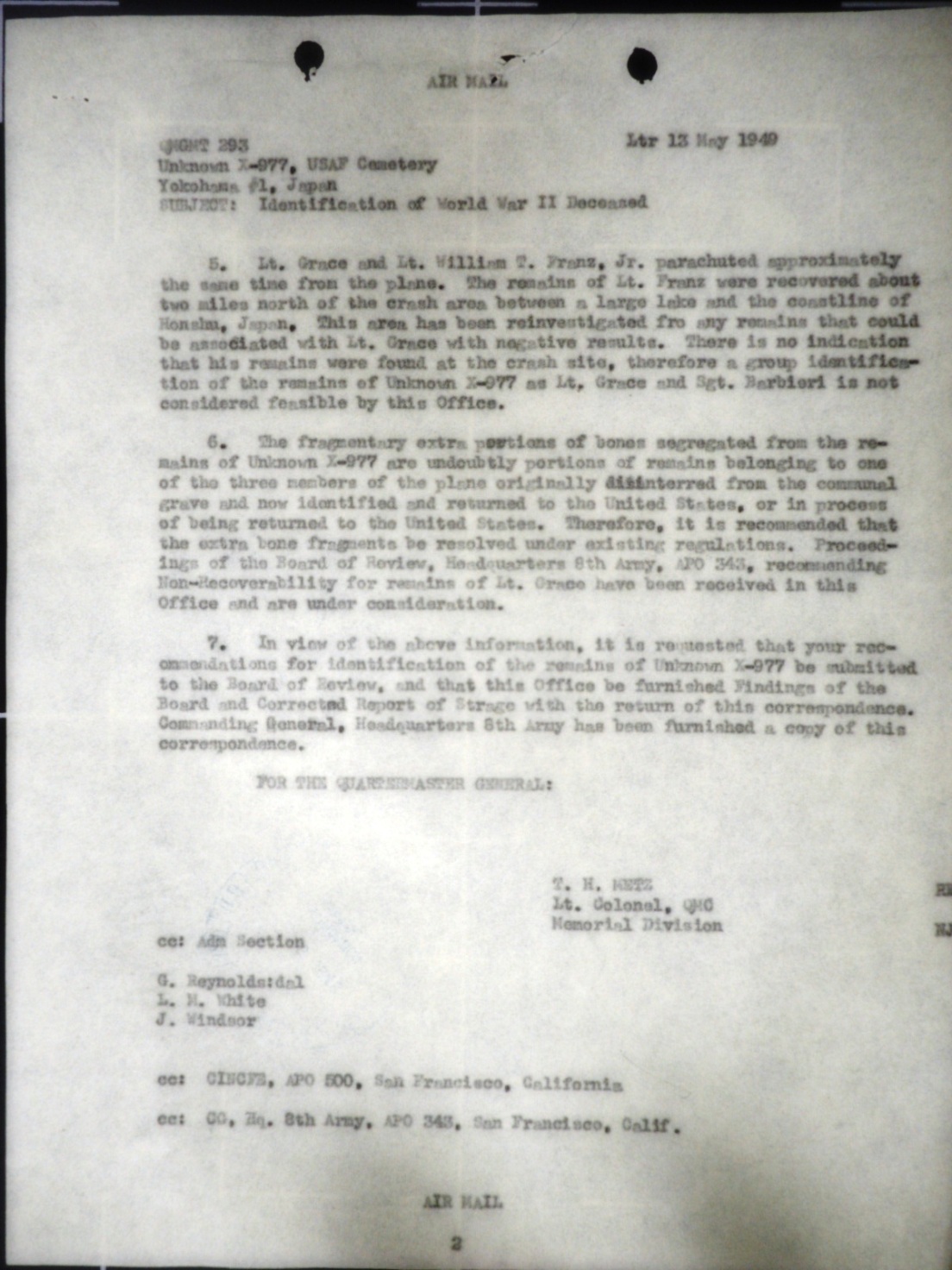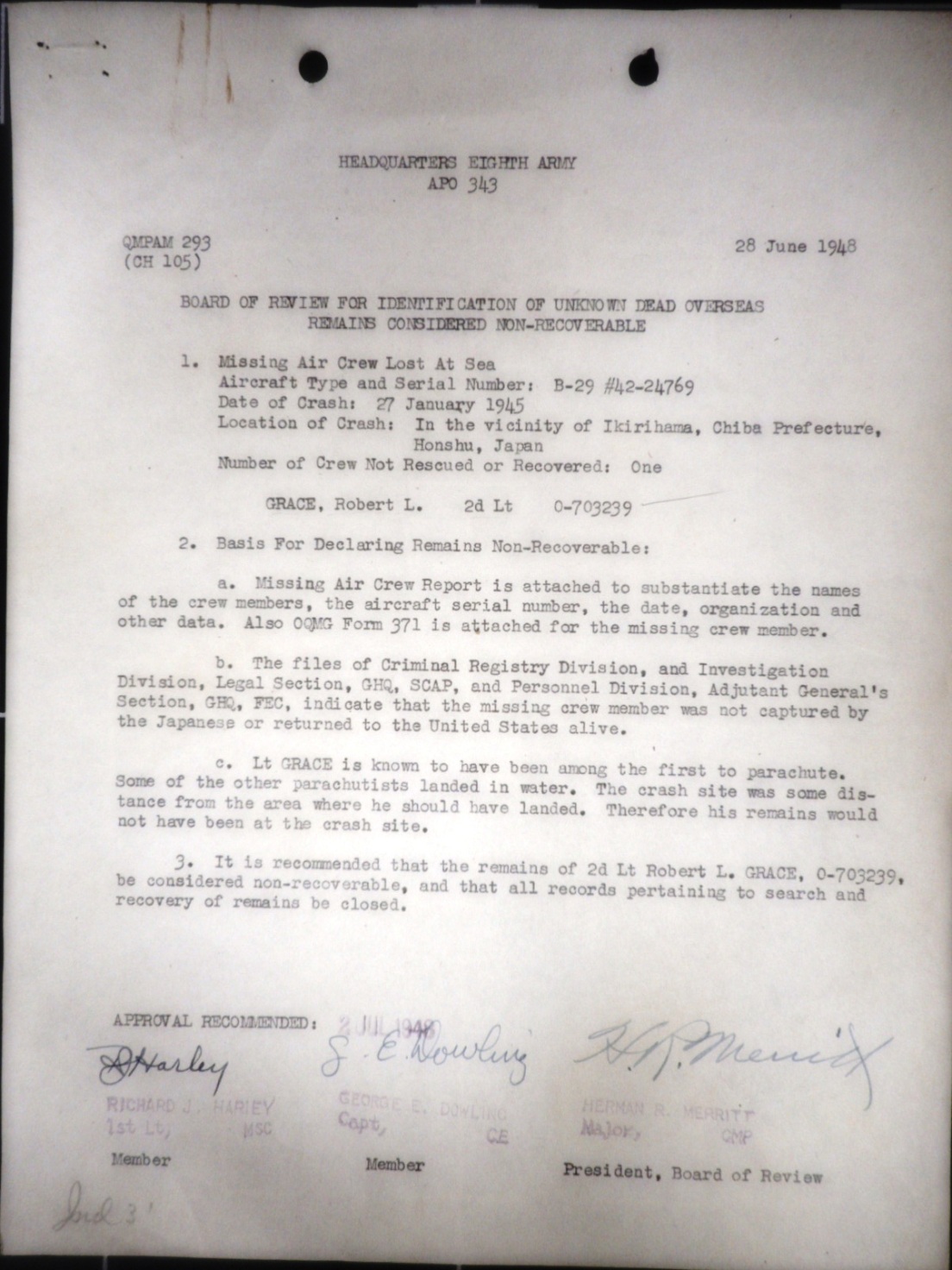 The conclusion of the Board of Review concerning Lt Grace was that This is followed by two letters from April and May 1948. |