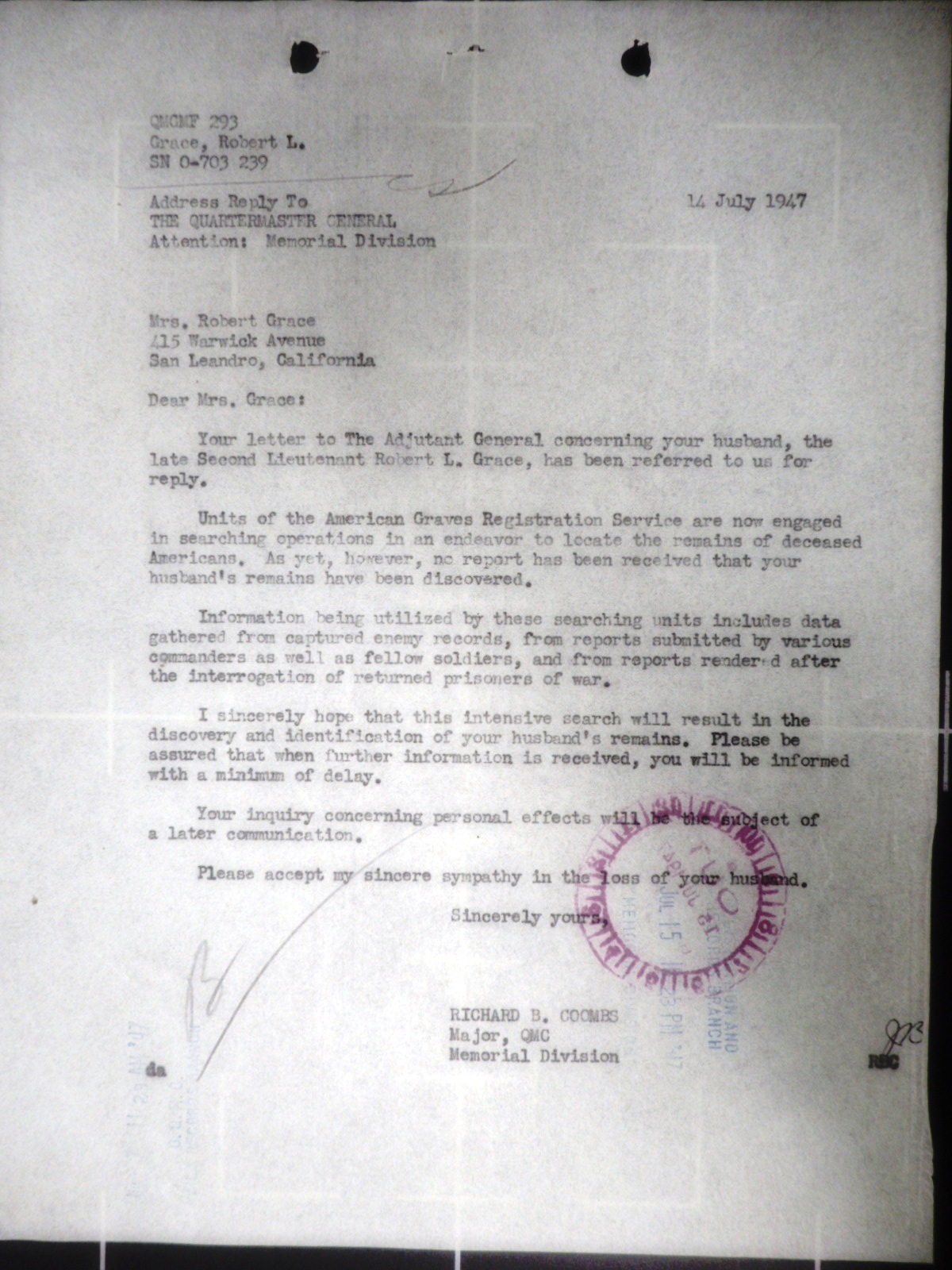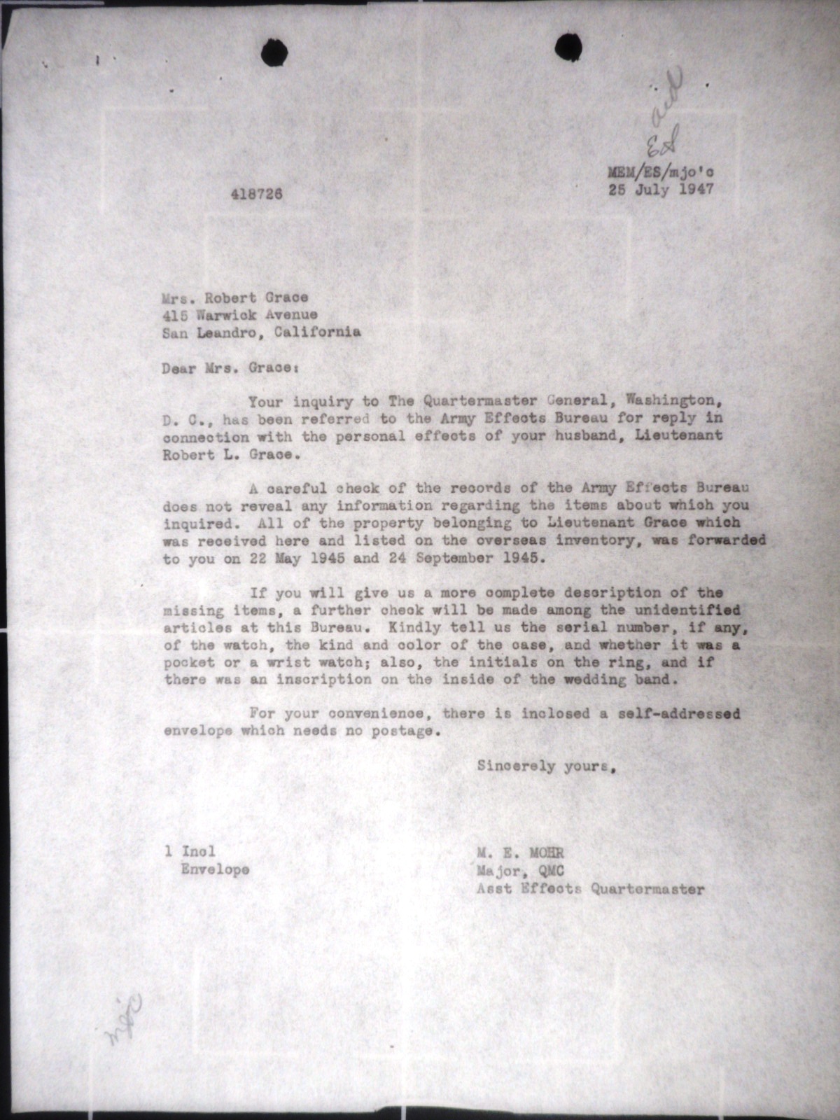 between his wife, Mrs Lesley Agnes Grace, and the US Army. Two of the four below letters concern personal effects. The other two are replies to Mrs. Grace's concerns about the death of her husband. |