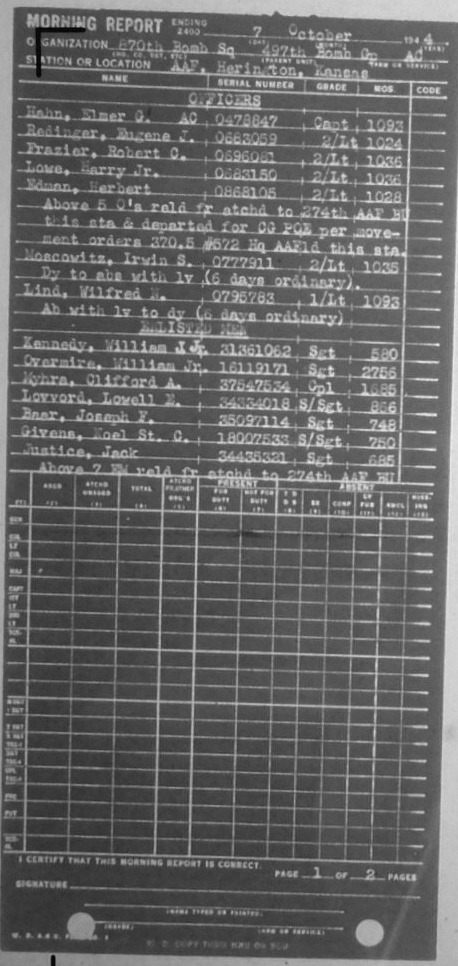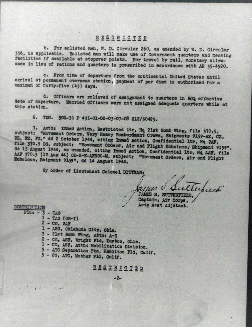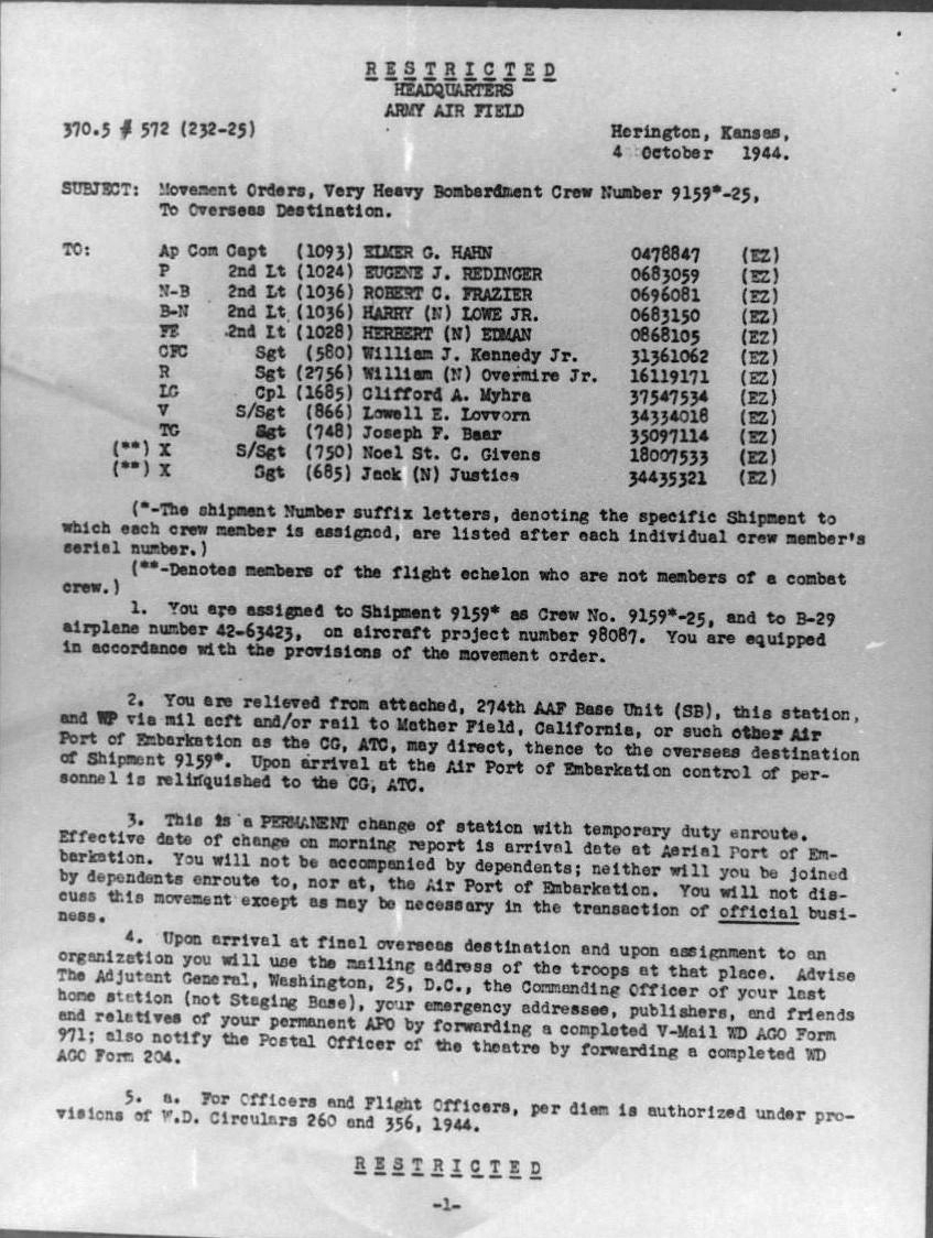 Listed are the five officers and five of the regular enlisted crew along with two passengers, one who is Ground Crew Chief. This is followed by the Movement Order issued at Herington AAF, 4 October 1944 |