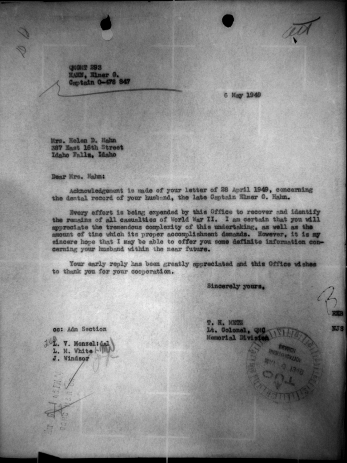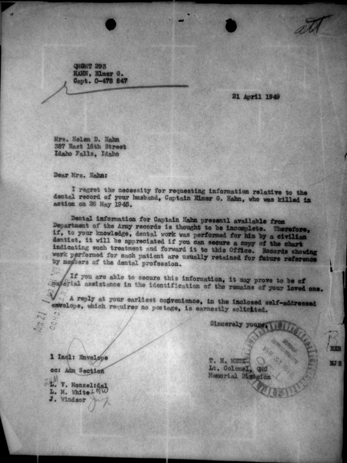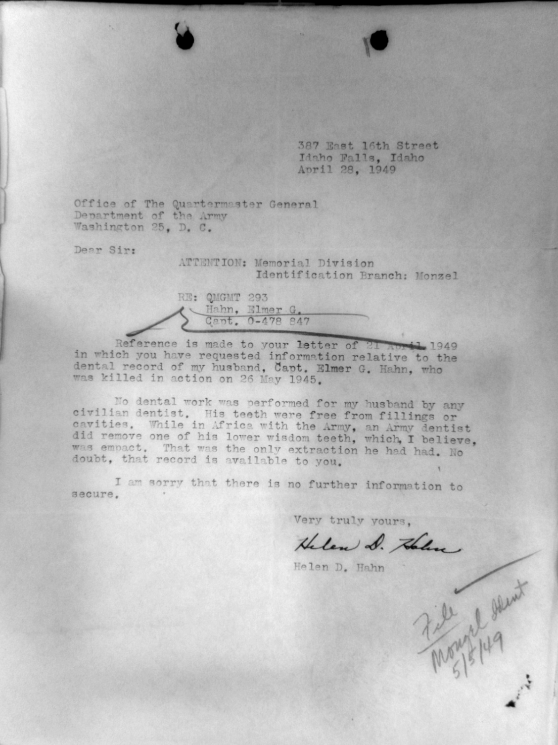 There is a surprising lack of correspondence within Captain Hahn's IDPF. The below letters to Mrs Helen Hahn are dated April and May 1949. These concern the Memorial Division's request for Capt Hahn's civilian dental records.
