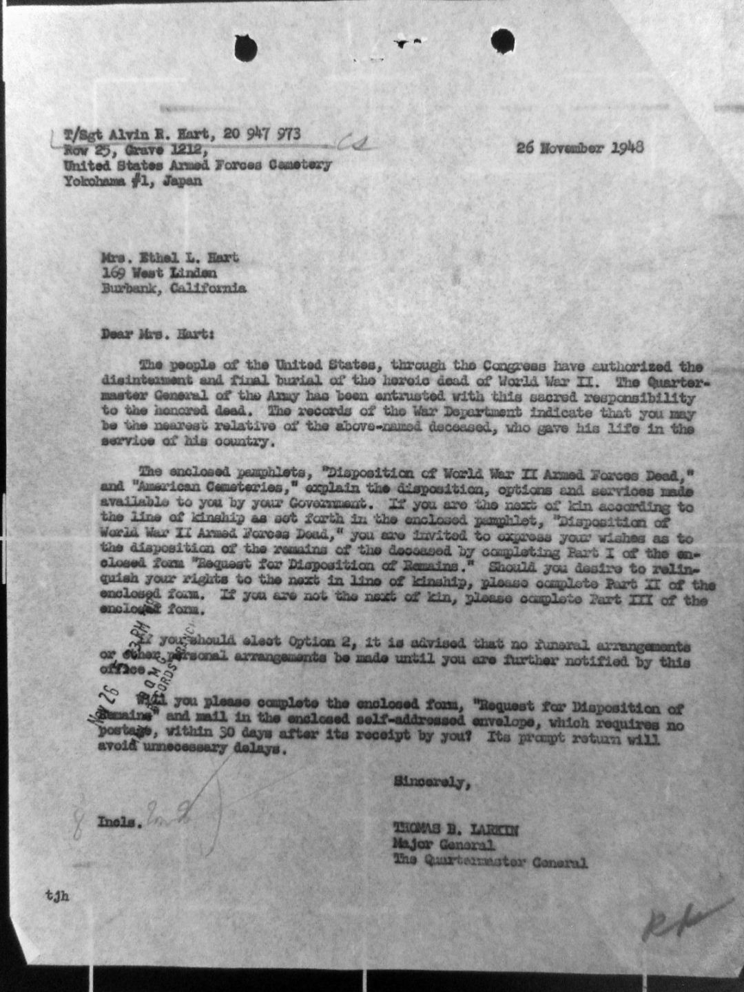 LETTER TO MRS ETHEL L HART (MOTHER) FROM MAJOR GENERAL LARKIN 26 NOVEMBER 1948
