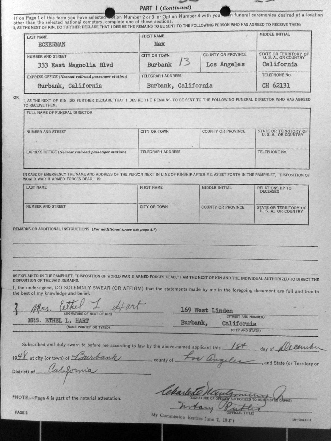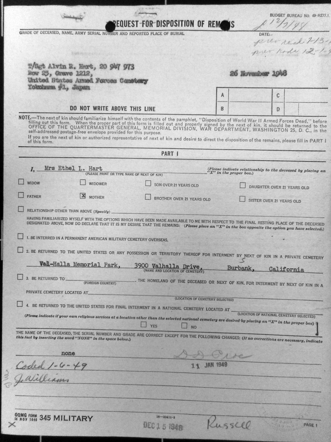 REQUEST FOR DISPOSITION OF REMAINS MRS ETHEL HART 26 NOVEMBER 1948