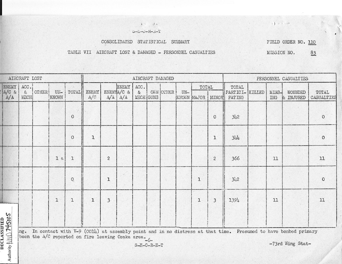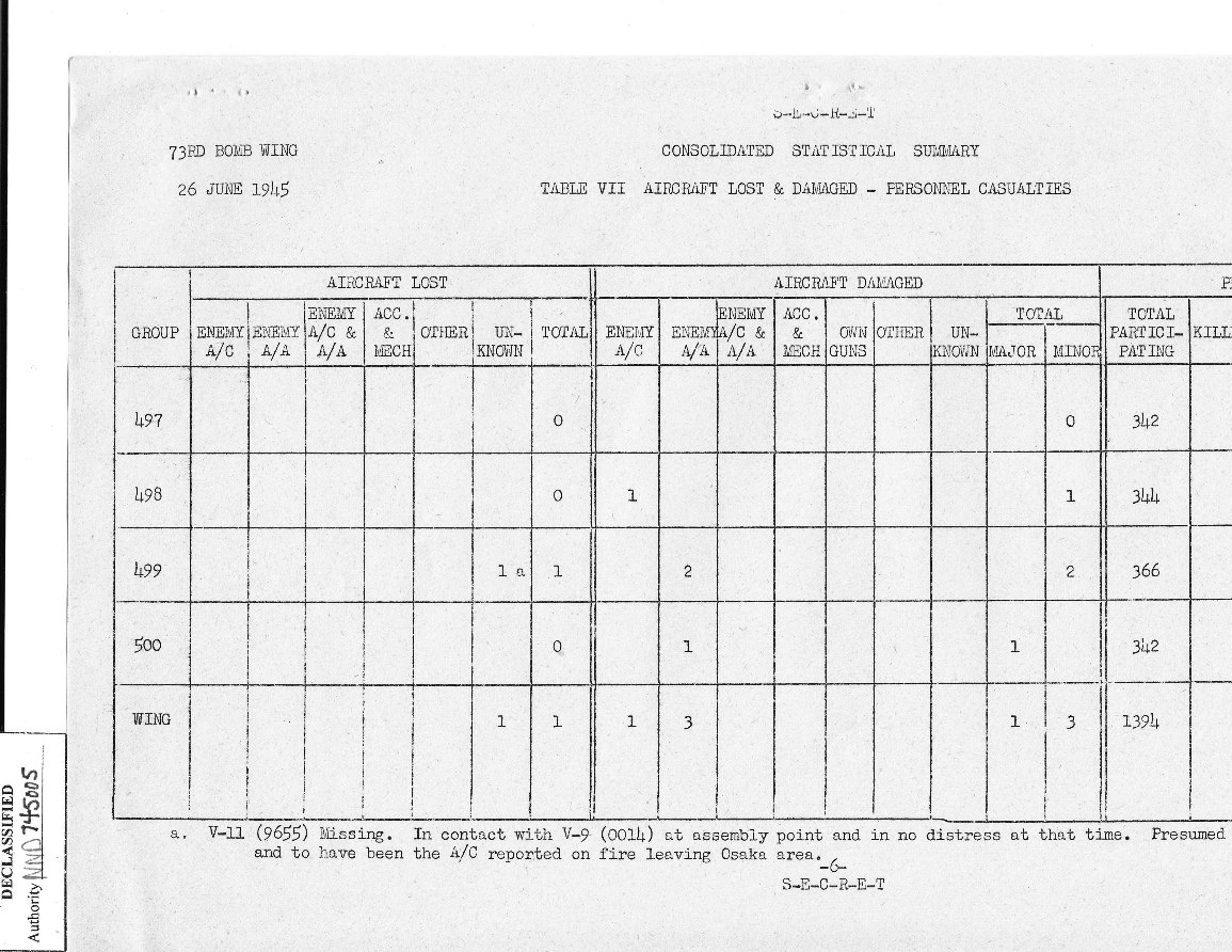 TABLE OF AIRCRAFT LOST AND DAMAGED - PERSONNEL CASUALTIES