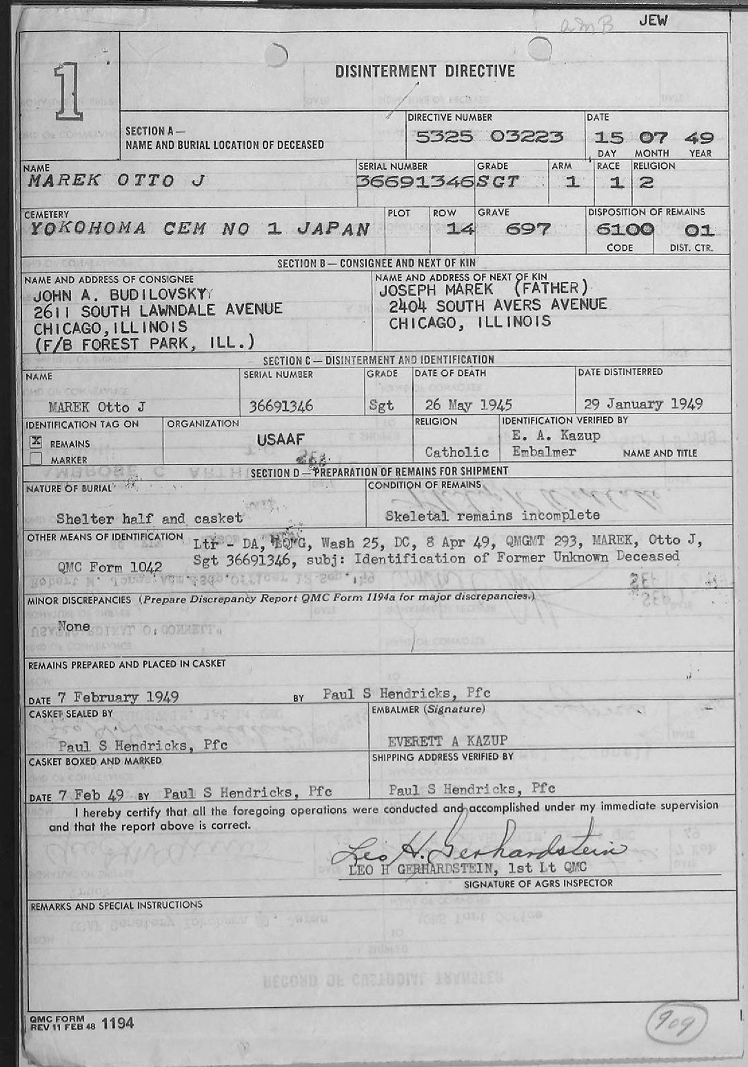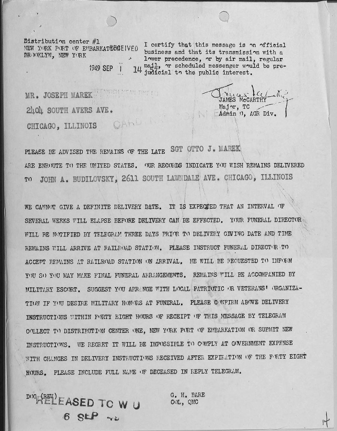 LETTER TO MR JOSEPH MAREK NOTIFICATION THAT HIS REMAINS ARE ENROUTE TO THE U.S. 1 SEP 1949