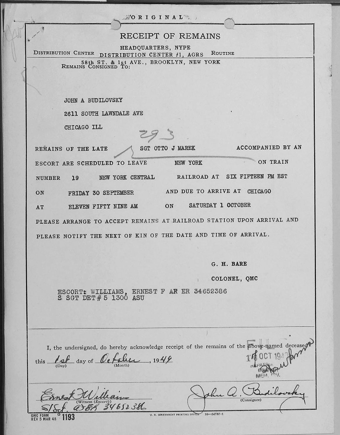 RECEIPT OF REMAINS 1 OCTOBER 1949