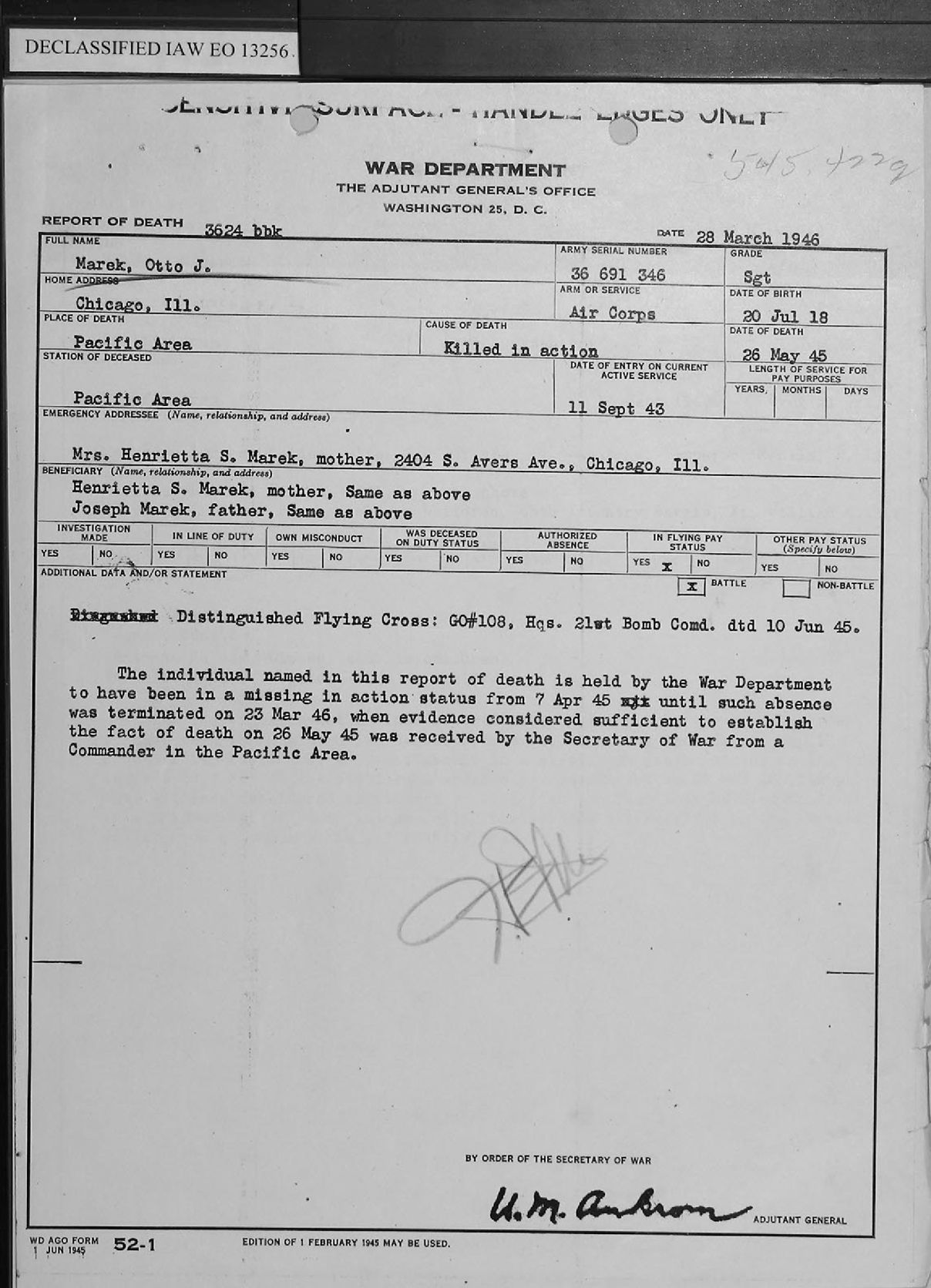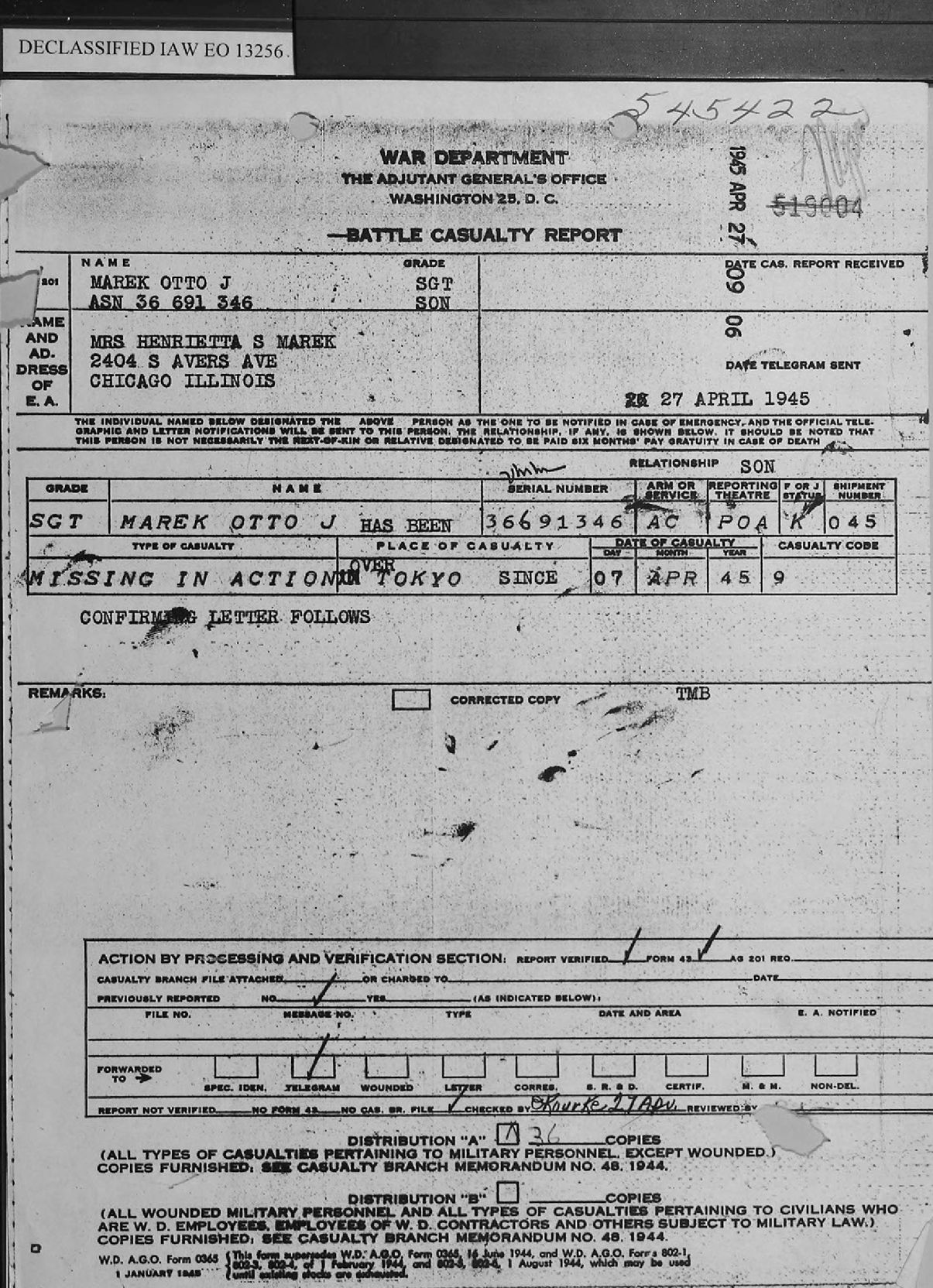 Sgt Otto John Marek Tokyo Military Prison Official Documents