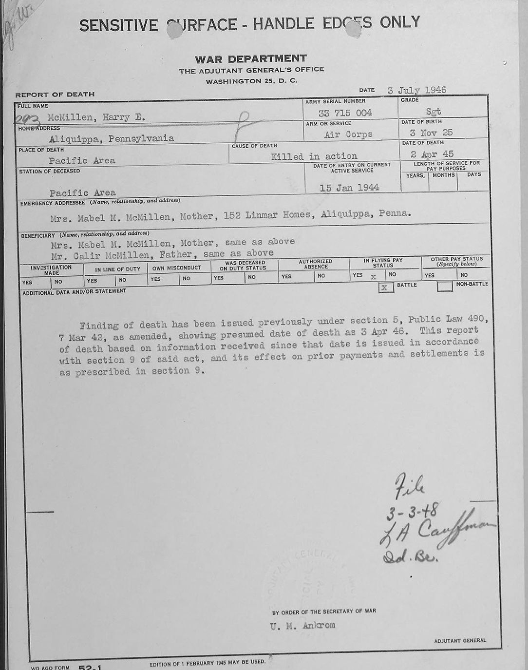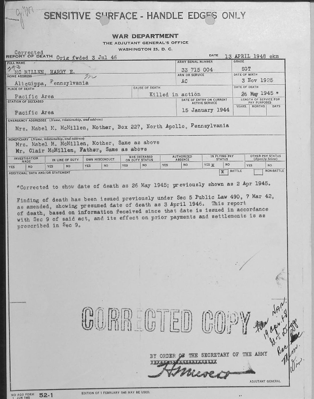 REPORT OF DEATH 13 APRIL 1948 CORRECTED