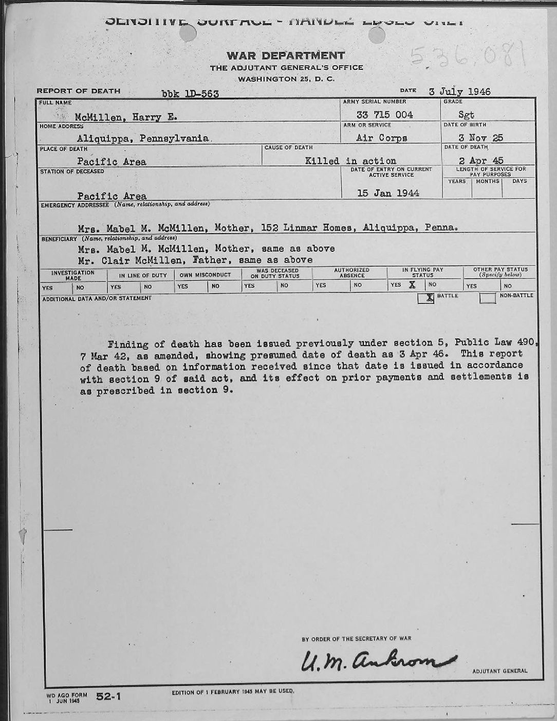 REPORT OF DEATH 3 JULY 1946