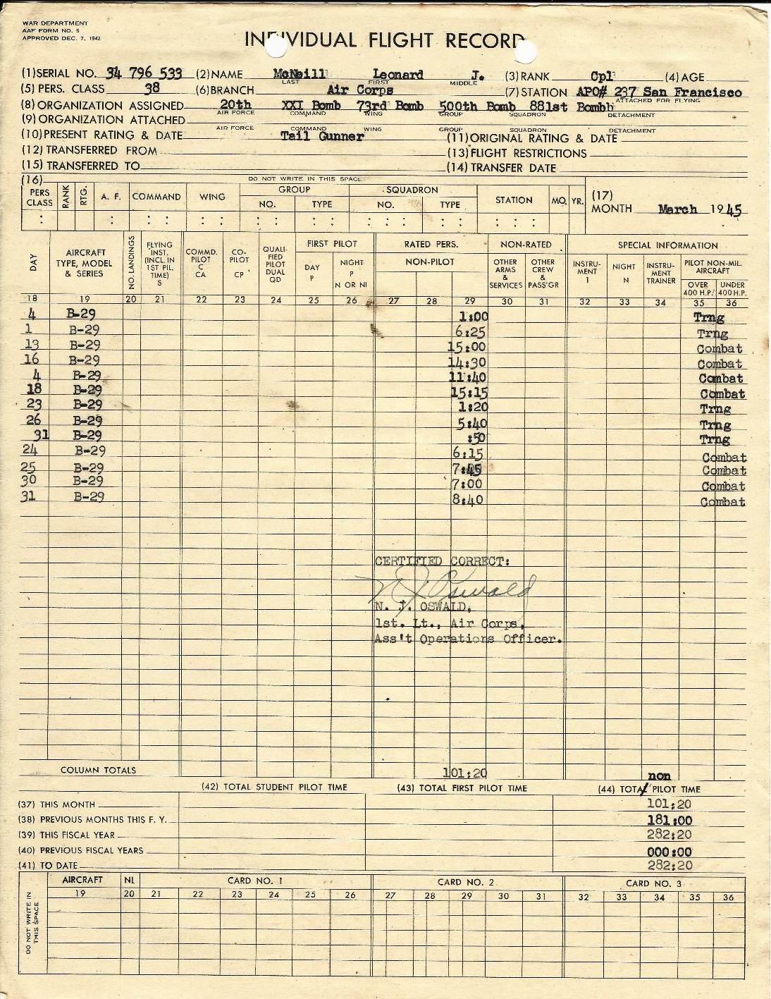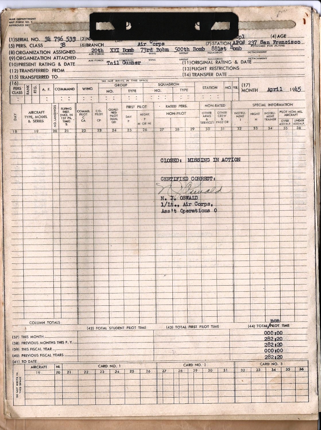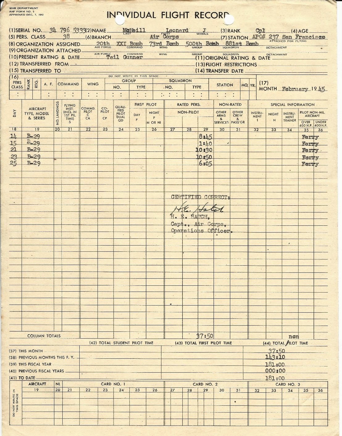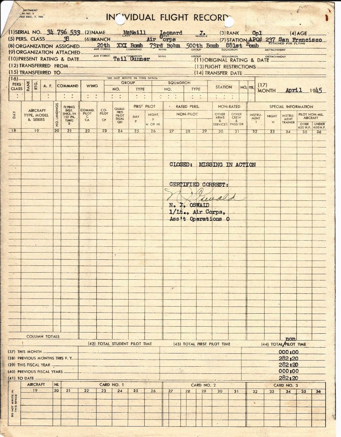 station "somewhere in the Pacific". Sgt McNeill is now assigned to the 73rd Bomb Wing (VH) , 500th Bomb Group (VH), 881st Bomb Squadron (VH). The last two IFRs concern Sgt McNeill's flying time in March 1945 and his status of Missing in Action in April. |