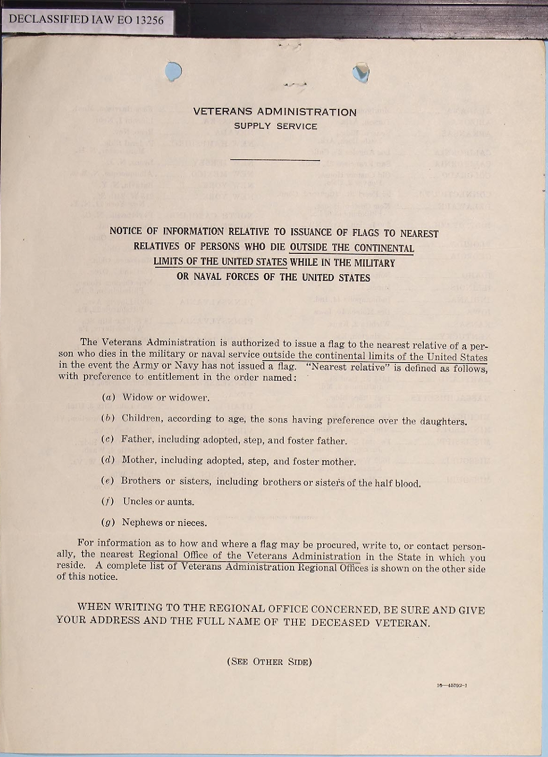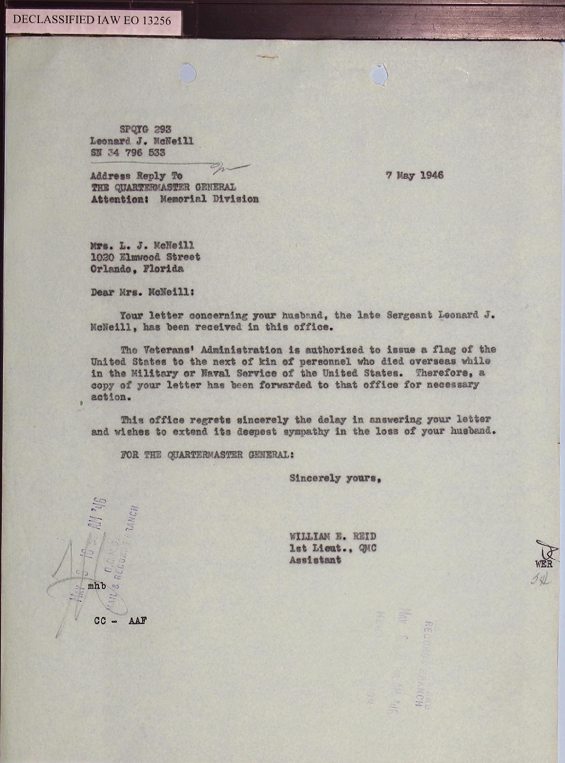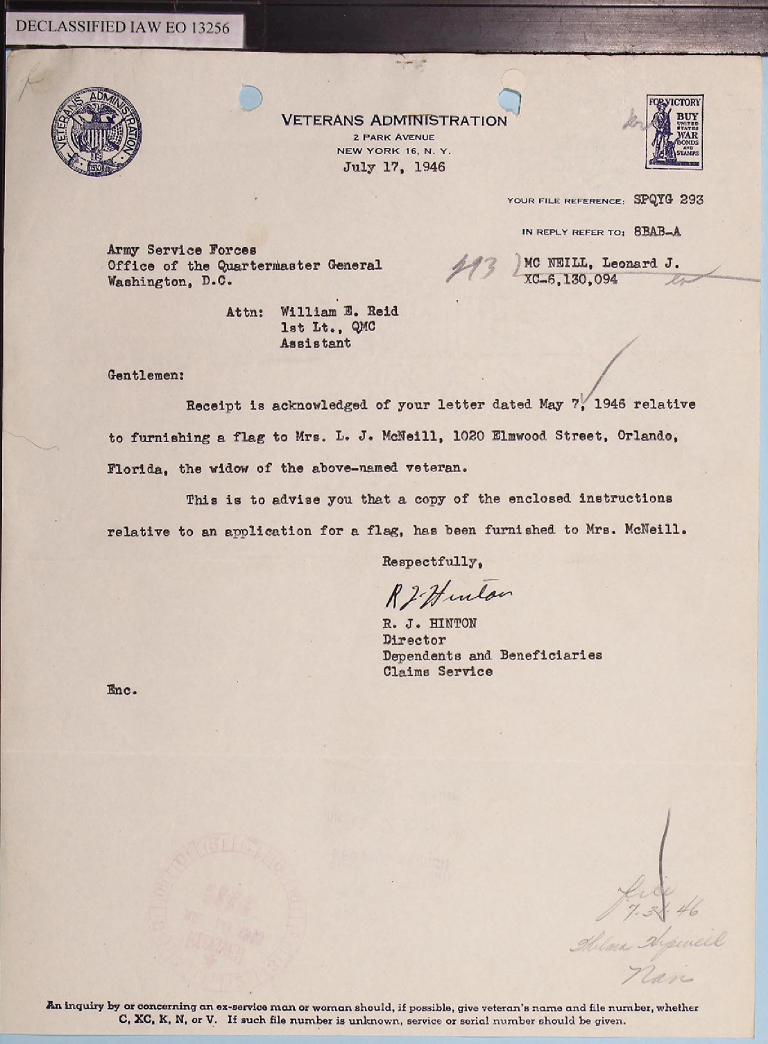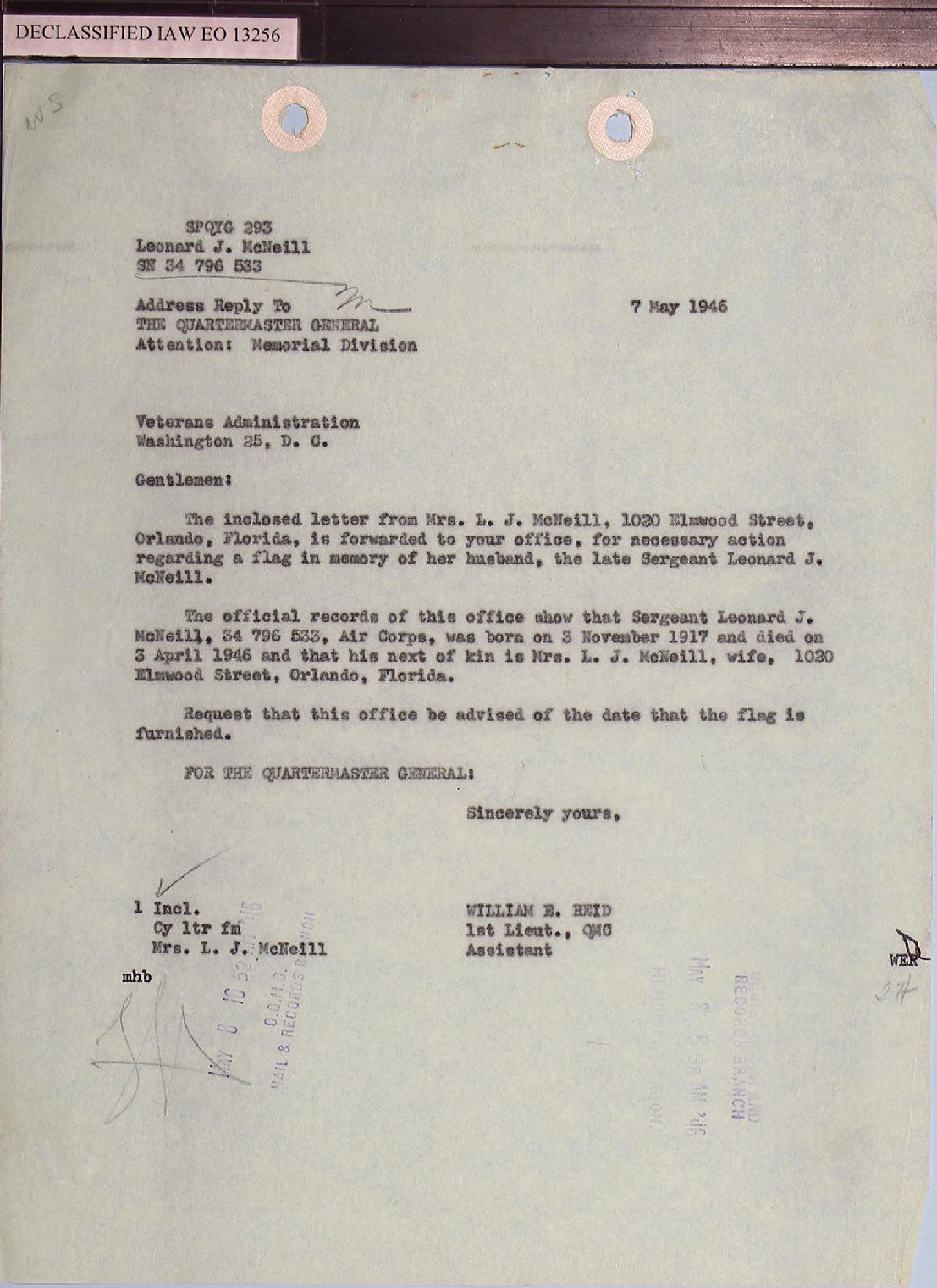 One was sent to the Veterans Administration and one to Melba. This is followed by a letter from the Veterans Administration informing the Quartermaster General that Melba had been sent instructions of how to obtain a flag. |