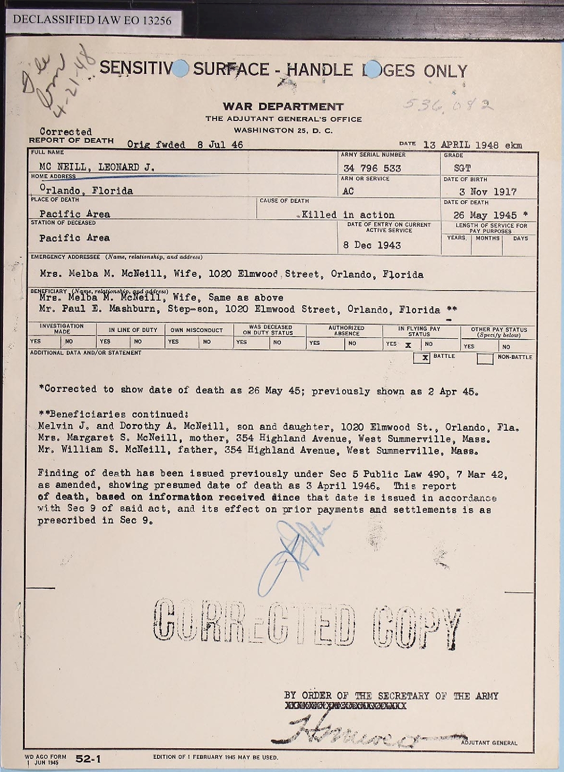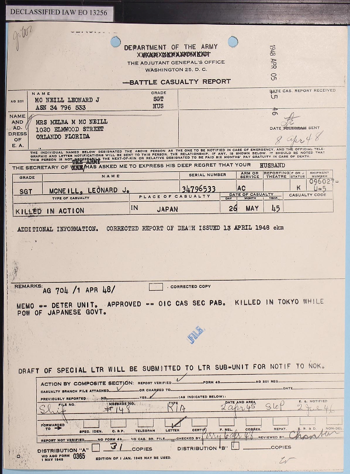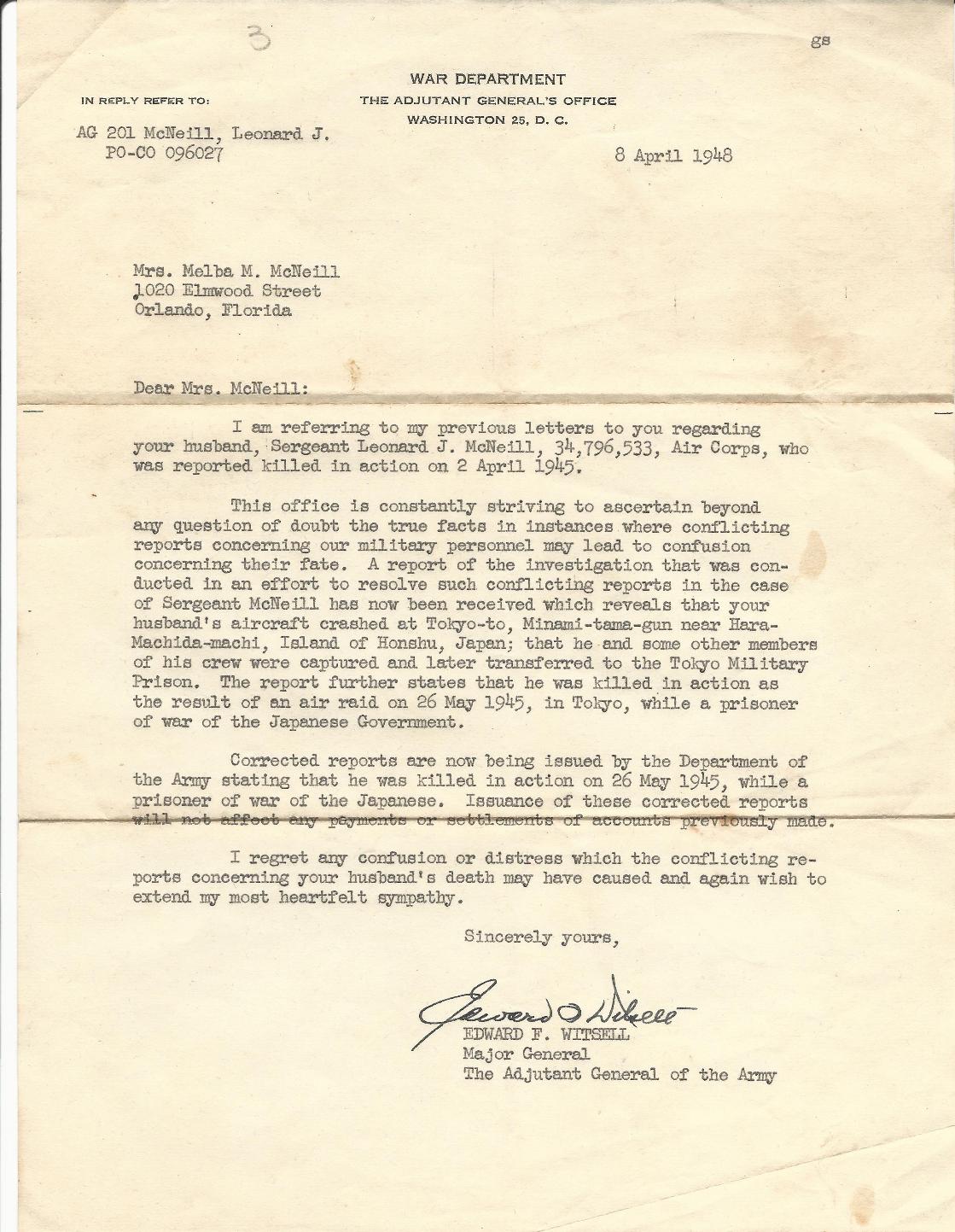 The below documents are dated April 1948. At the bottom of the REMARKS section of the Battle Casualty Report is the notation concerning a draft of a special letter to be sent to the next of kin. The letter to Melba from Major General Edward F Witsell |