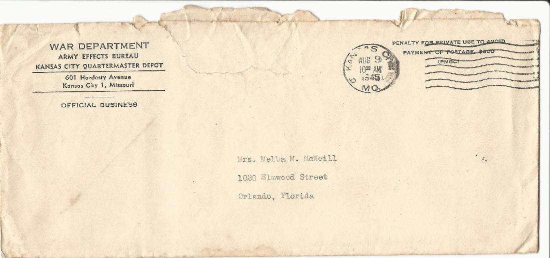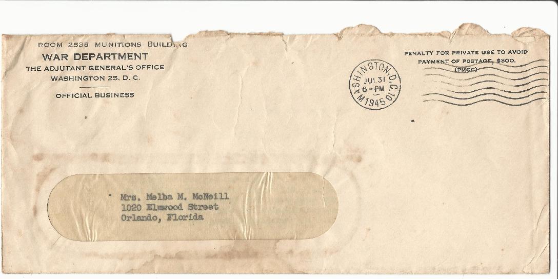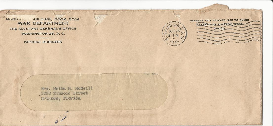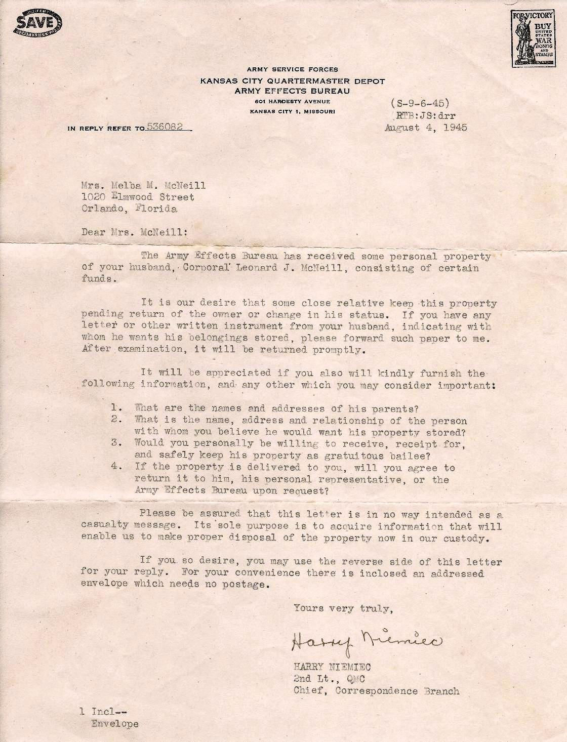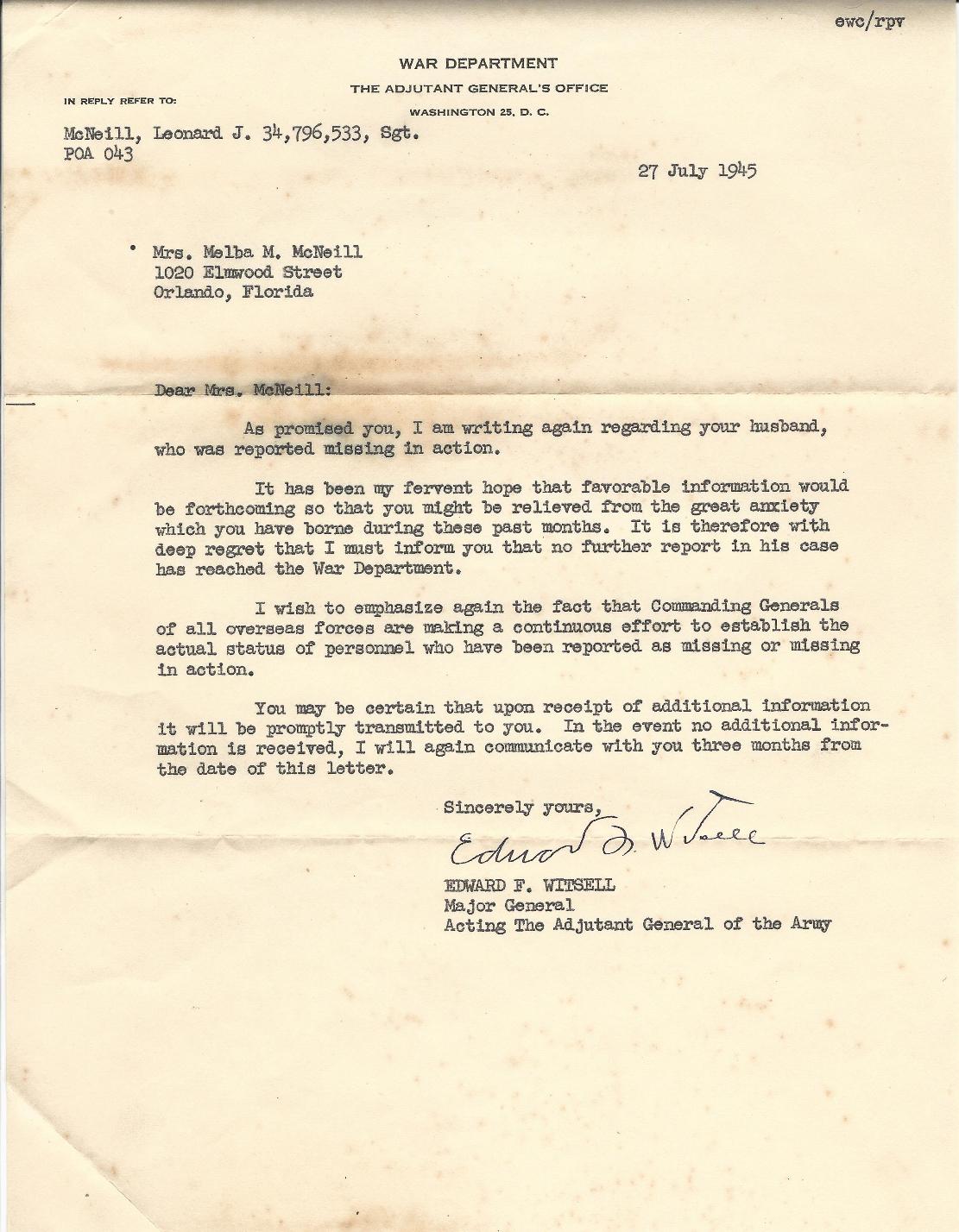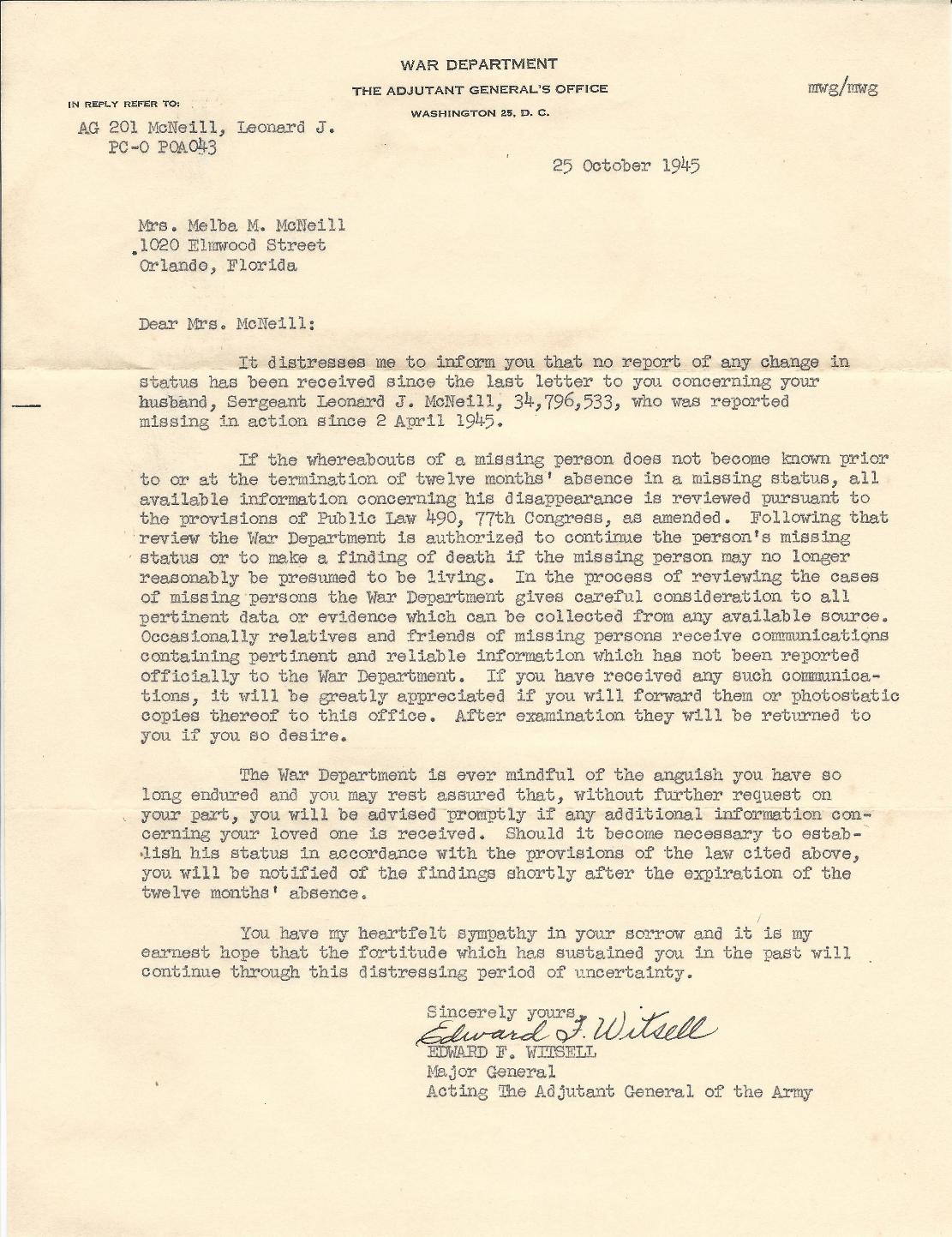 Two of the three letters on this page were written by Major General Edward F Witsell, Acting The Adjutant General of the Army. The first is dated 31 July 1945 and his second on 26 October 1945. In each he regrets not being able to provide Mrs McNeill with any information concerning her husband Leonard. In between these two letters is one from the Army Effects Bureau. |