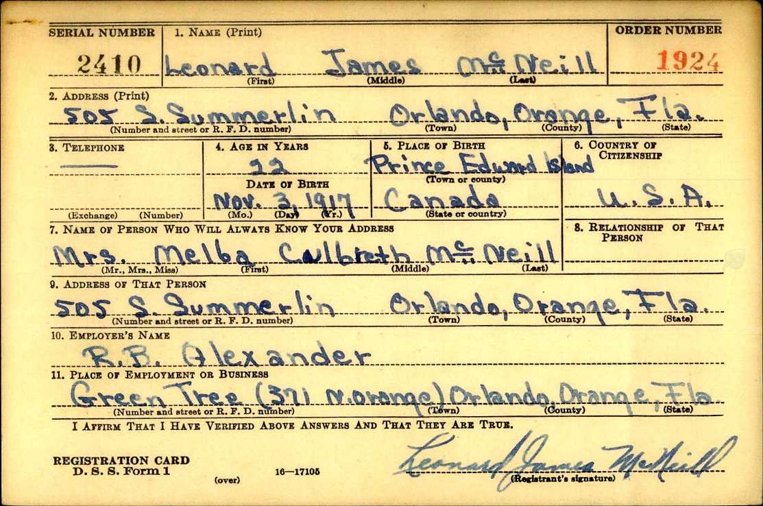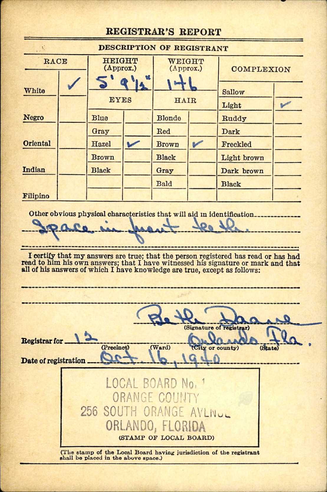 REGISTRATION CARD FRONT 16 OCTOBER 1940 ORLANDO, FLORIDA