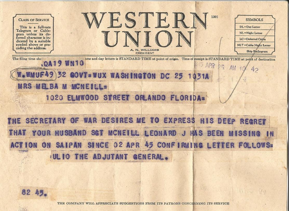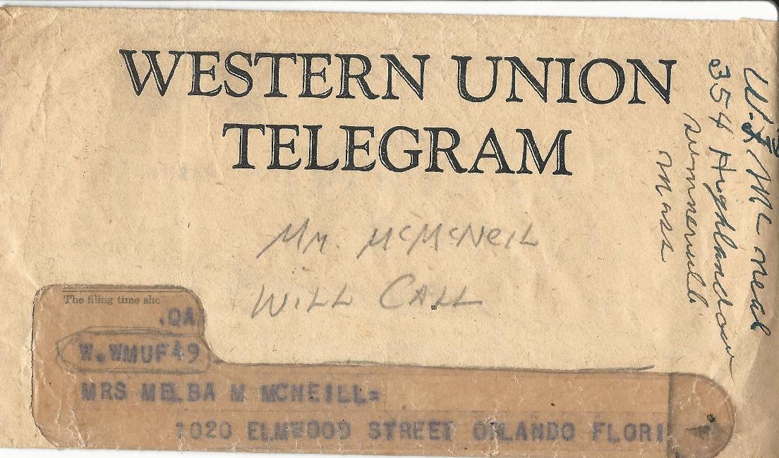 Below is the telegram that Melba received informing her