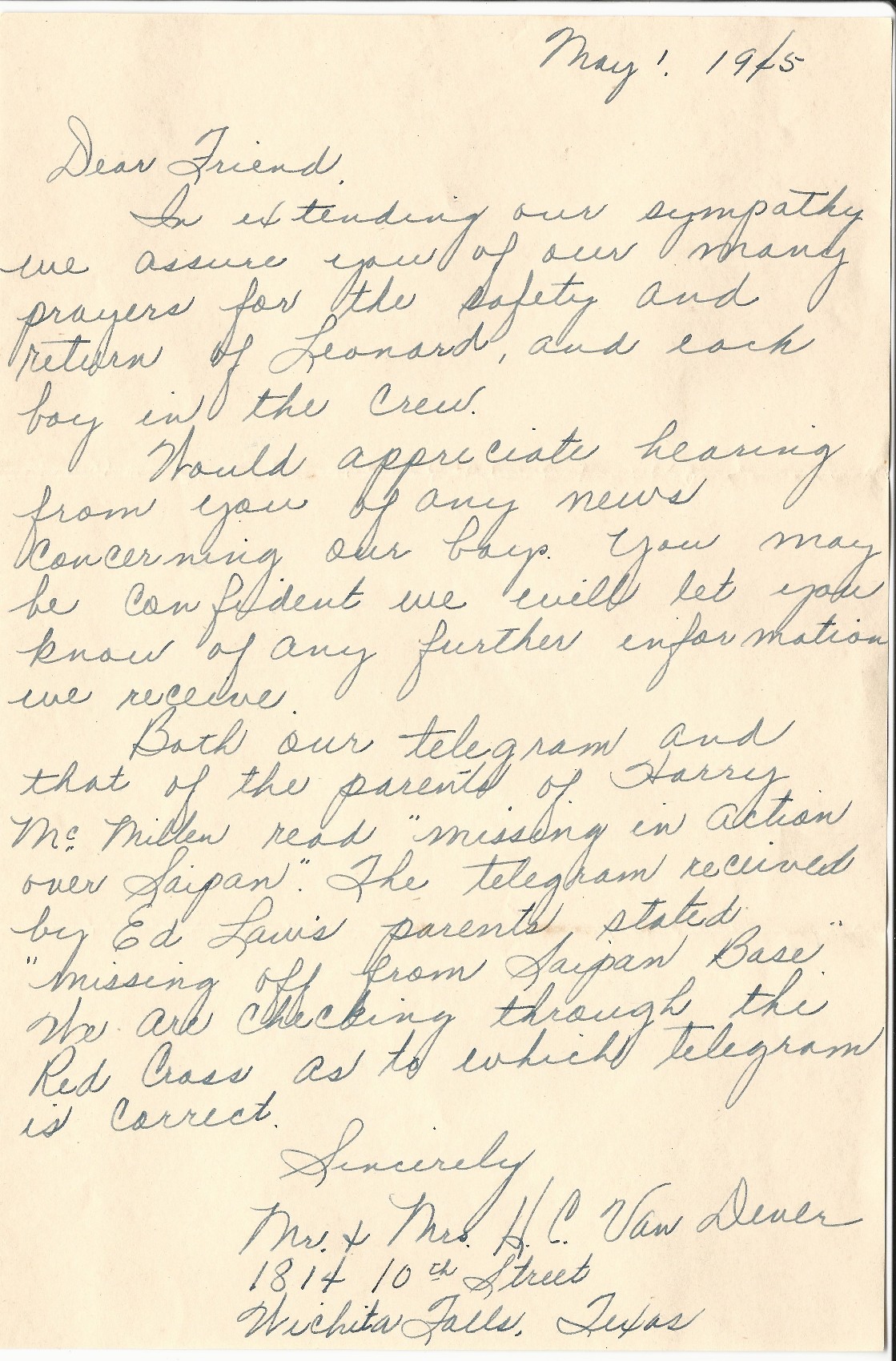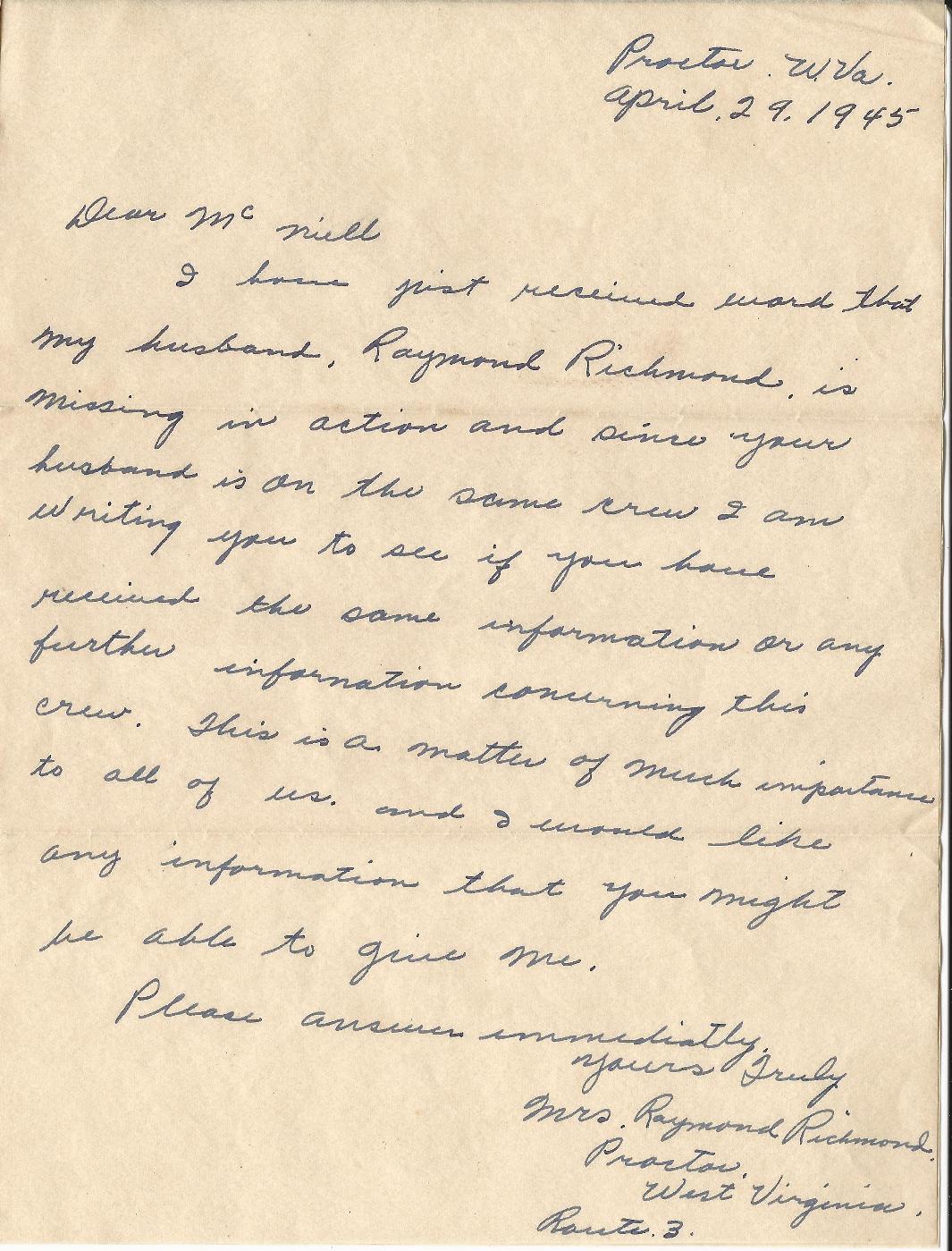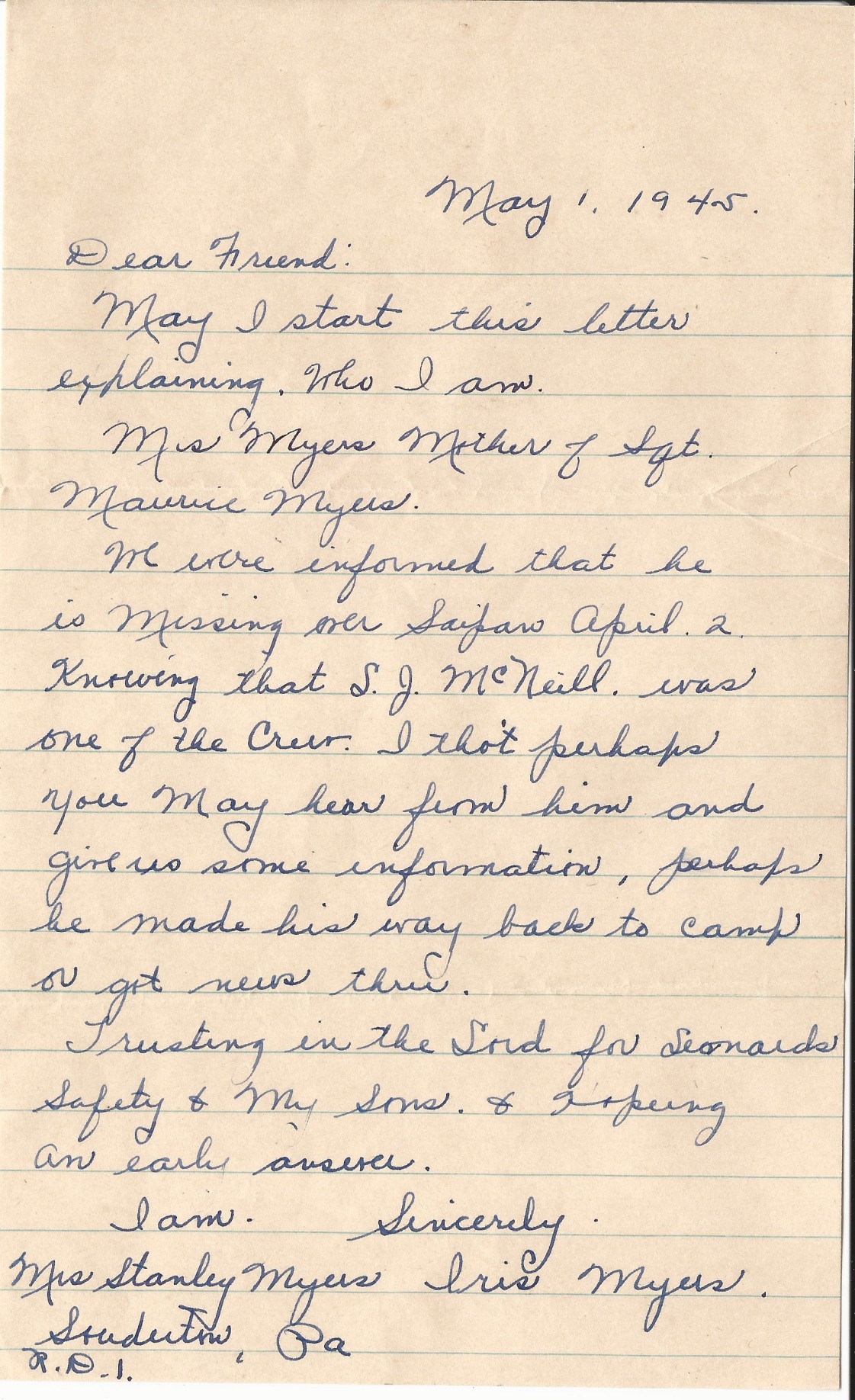 Four letters all sent to Melba 29 April 1945 Mrs Raymond Richmond 1 May 1945 Iris Myers mother of Maurice W Myers